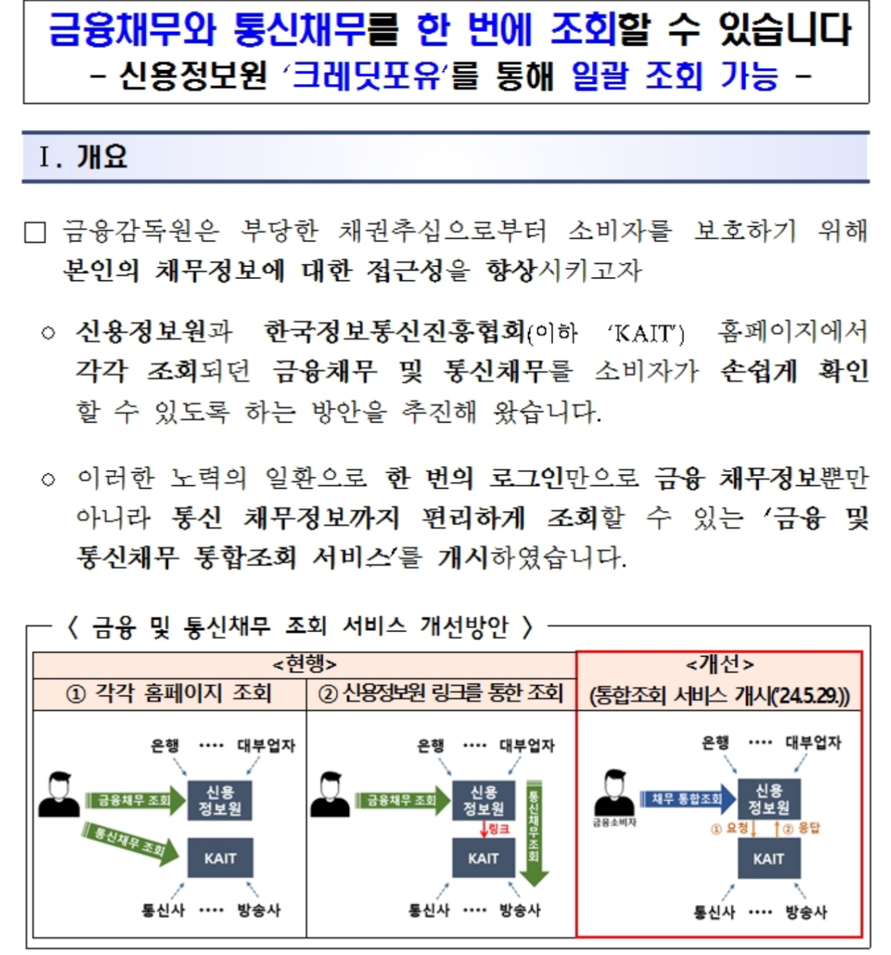 이번 개선을 통해 소비자들은 금융채무 및 통신채무를 한꺼번에 조회할 수 있게 되어 채무 관리에 도움이 될 것으로 기대된다고 밝혔습니다.