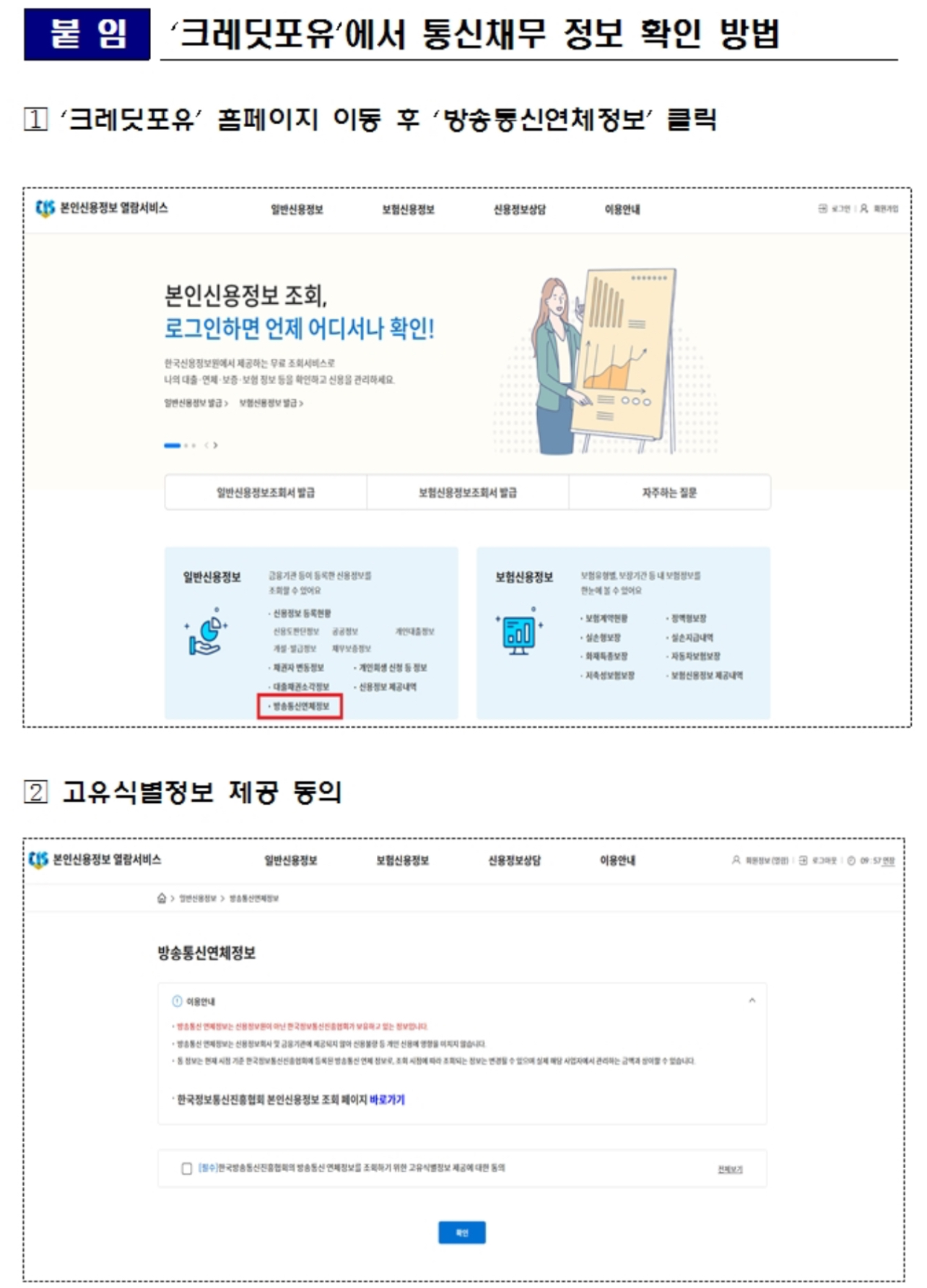 이를 보완하기 위해 시스템 개편을 추진하여 신용정보원의 ‘크레딧포유’(www.credit4u.or.kr)에서 통신채무까지 한 번에 바로 확인할 수 있도록 개선했다고 합니다.