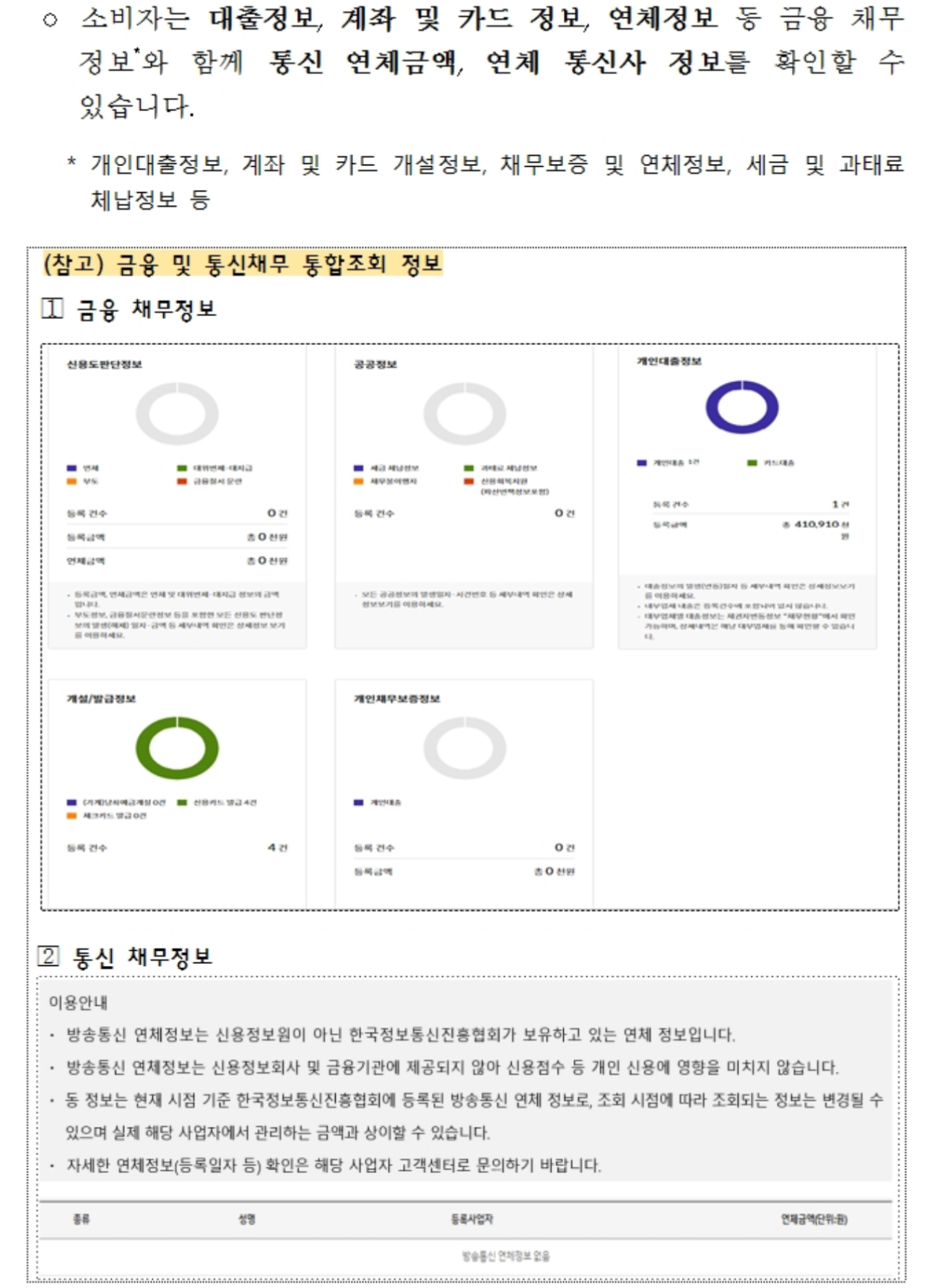소비자는 대출정보, 계좌 및 카드 정보, 연체정보 등 금융 채무정보와 함께 통신 연체금액, 연체 통신사 정보를 확인할 수 있습니다.