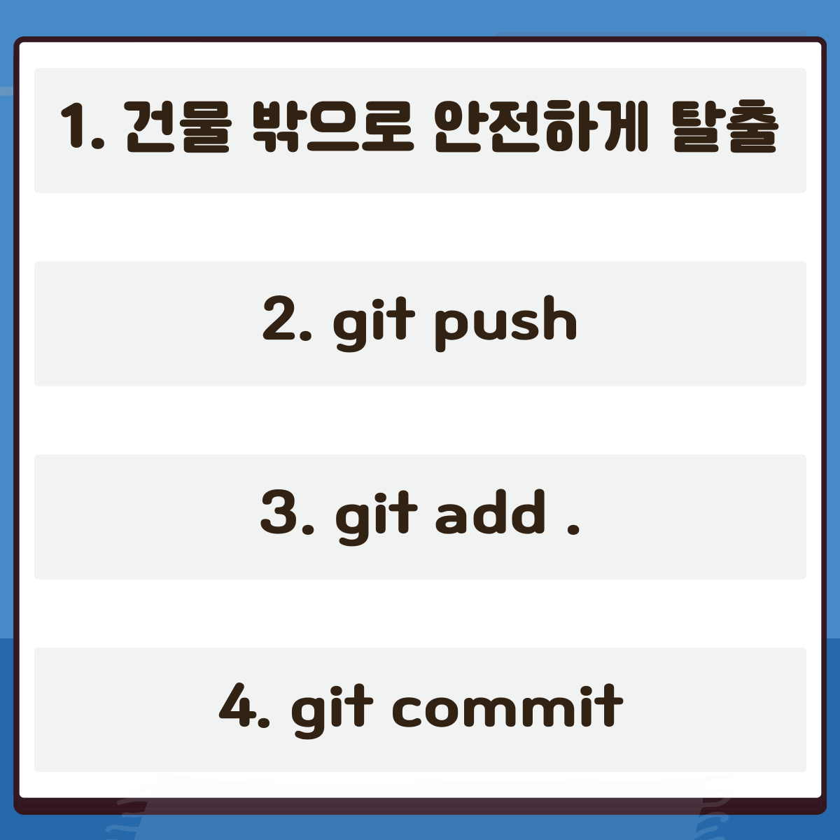Q. 1 개발 중 화재가 났다. 다음 중 해야하는 것으로 맞는 순서는?