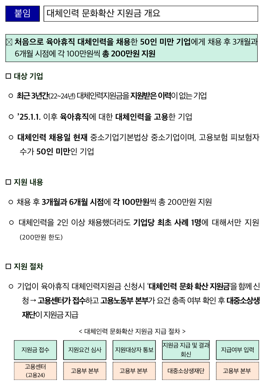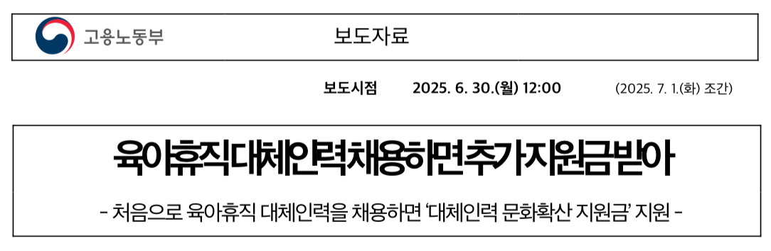 육아휴직 대체인력을 처음으로 채용한 중소기업을 대상으로 한 ‘대체인력 문화확산 지원금’이 2025년 7.1.(화)부터 지원되기 시작했습니다.