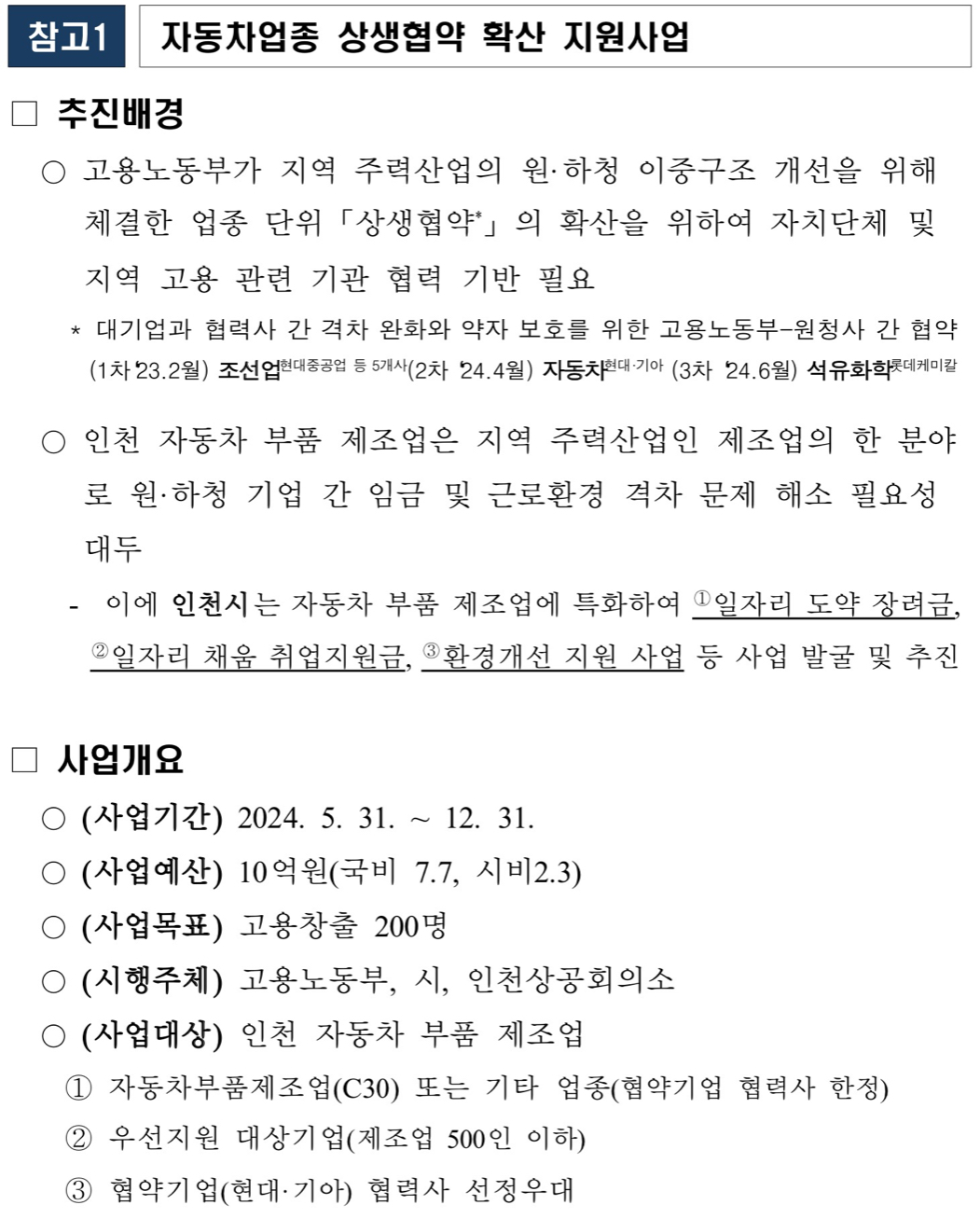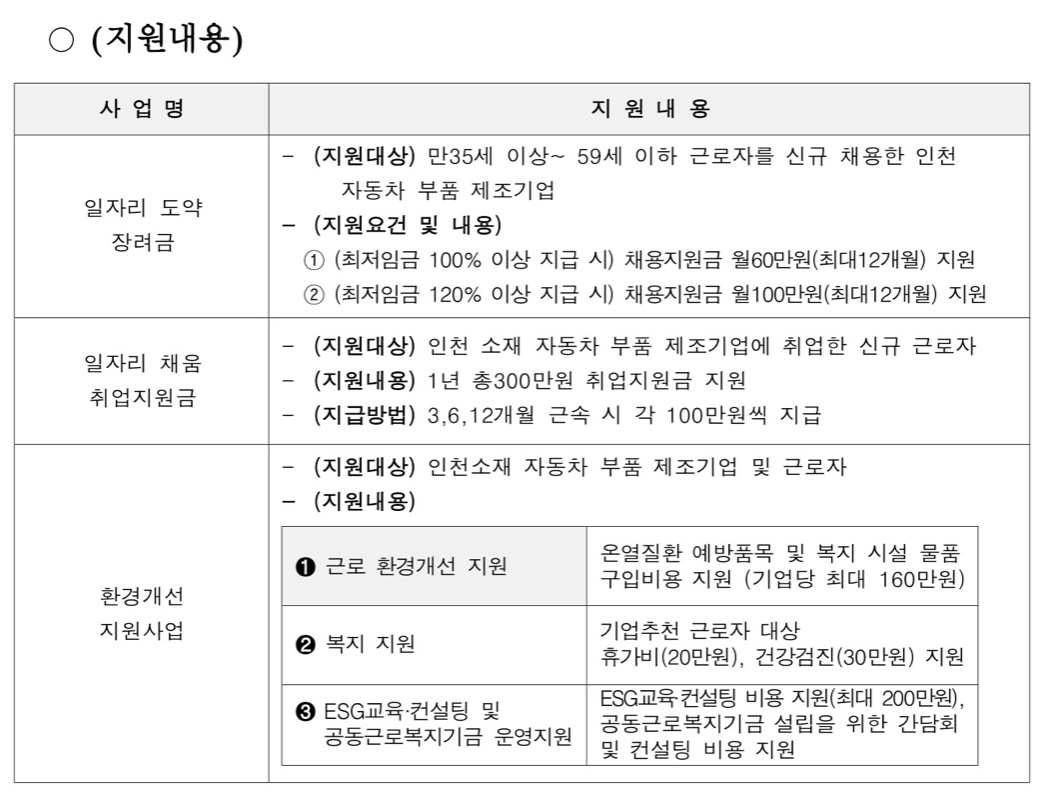 인천시는 인천상공회의소와 함께 ‘인천 상생 패키지지원 프로젝트’ 명칭으로 사업을 추진하는데, 인천 내 자동차 부품 제조기업을 대상으로 ▲일자리 도약 장려금 ▲일자리 채움 취업지원금 ▲환경개선을 지원한다고 합니다.