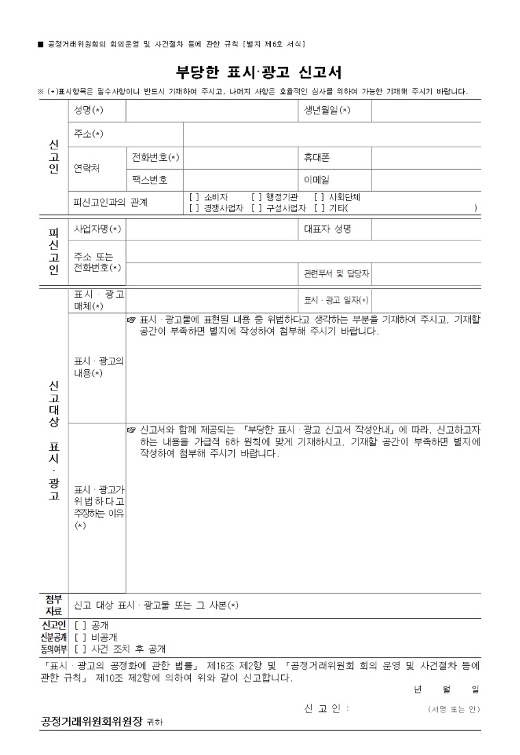 참고로 꼭 공정위가 정한 신고서로 작성해야 하는지 묻는 분들이 계시는데 표시광고법은 신고와 관련하여 「독점규제 및 공정거래에 관한 법률 시행령」 제54조(위반행위 신고방법)를 따르고 있습니다.