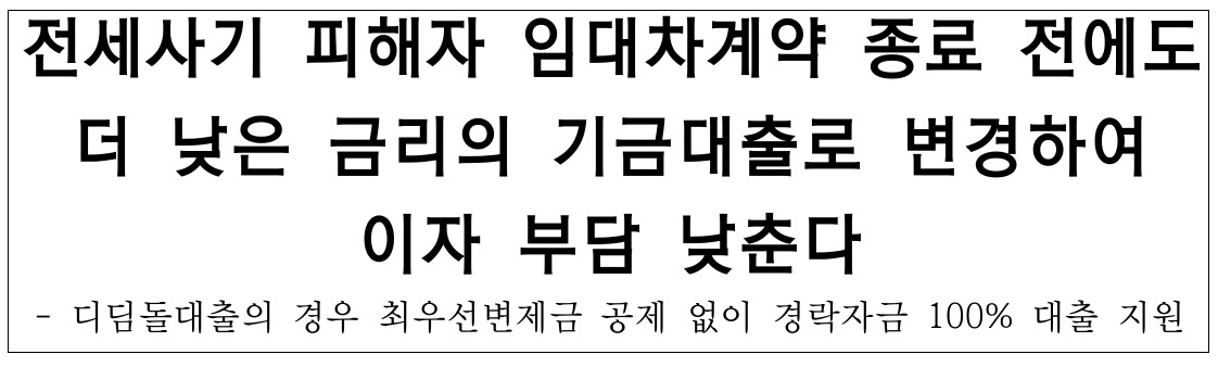 기존에는 피해자가 전세사기 피해주택을 낙찰받아 디딤돌 구입자금대출을 이용하려고 하는 경우 최우선변제금만큼은 제외(약 80% 수준) 후 대출이 이뤄져 왔는데 이제는 피해자 본인이 피해주택을 직접 낙찰받을 때 부담이 경감될 수 있도록 최우선변제금 공제 없이 경락자금의 100% 전액 대출을 지원한다고 합니다.