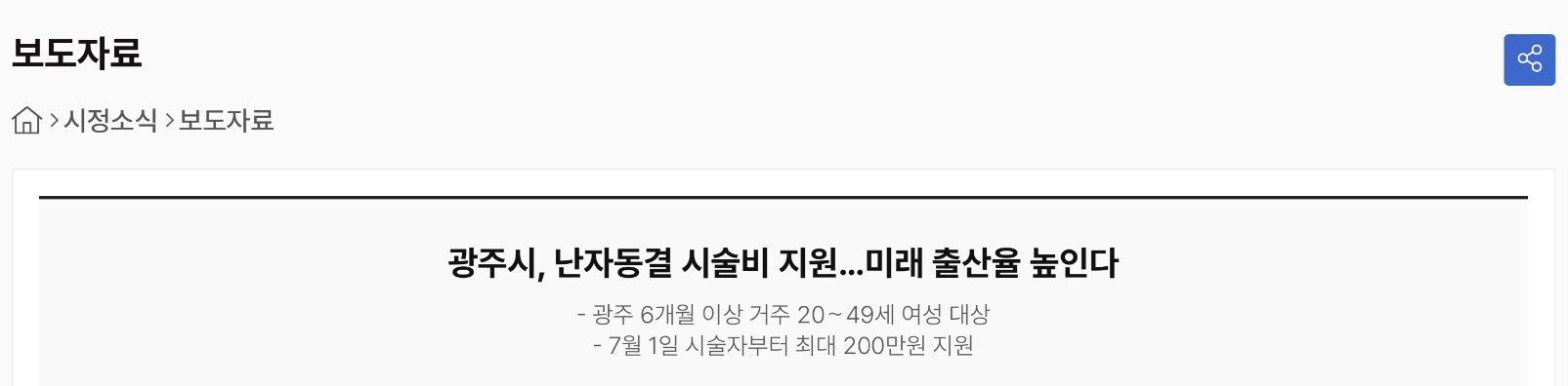 광주광역시는 오는 2024년 7월 1일부터 임신‧출산을 준비하기 위해 난자를 동결하는 여성의 경제적 부담을 줄이기 위해 시술비용의 50%(최대 200만원)를 지원할 계획이라고 합니다.