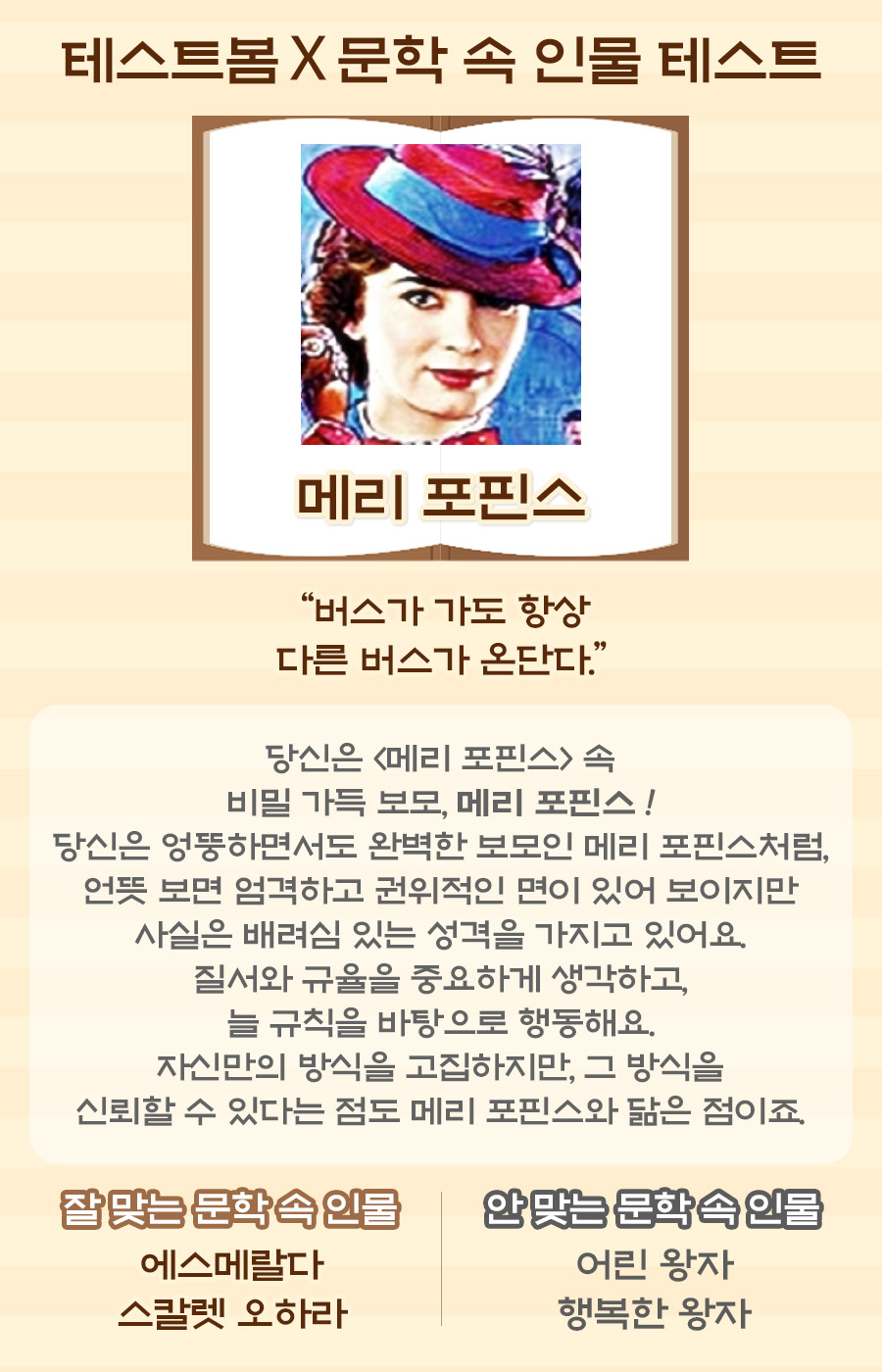 당신은 엉뚱하면서도 완벽한 보모인 메리 포핀스처럼, 언뜻 보면 엄격하고 권위적인 면이 있어 보이지만 사실은 배려심 있는 성격을 가지고 있어요.