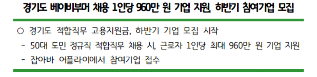 경기도와 경기도일자리재단은 도내 중장년층 구직자를 위한 안정된 일자리 기회 제공과 중소기업의 인력난 해소를 위해 ‘경기도 적합직무 고용지원금’ 사업의 하반기 참여기업을 오는 2024년 9월 20일까지 선착순 모집한다고 밝혔습니다.