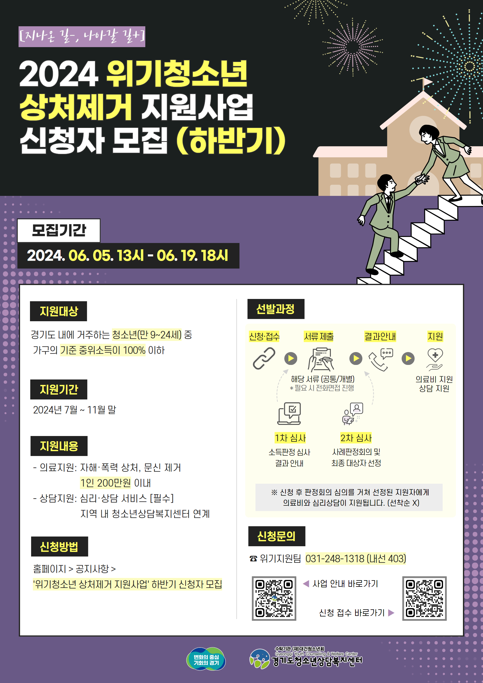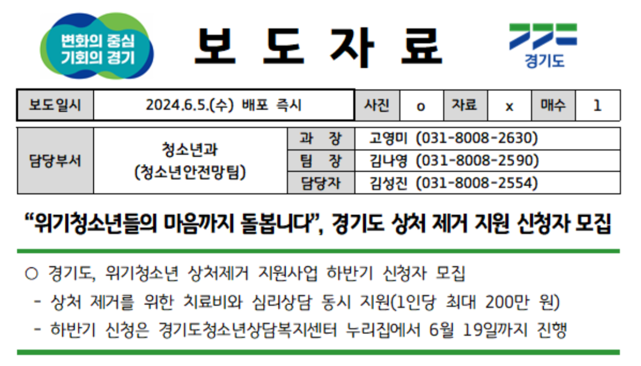 경기도가 2024년 6월 5일 오후 1시부터 2024년 6월 19일 오후 6시까지 자해 및 폭력으로 인한 상처, 문신 등으로 심리적 어려움을 겪는 청소년들에게 상처 제거를 위한 치료비와 심리상담을 지원하는 '위기청소년 상처제거 지원사업' 신청자를 모집한다고 합니다.
