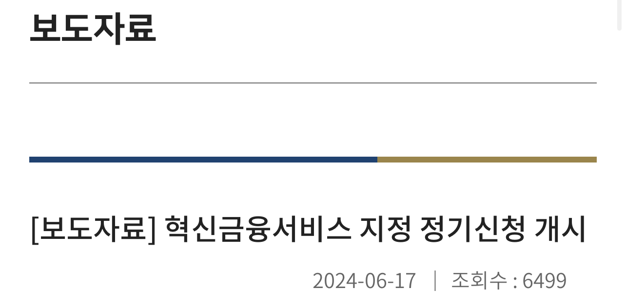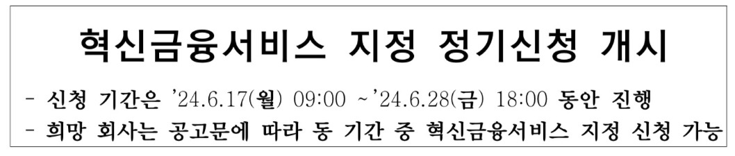 금융위원회는 2024년 올해 첫 혁신금융서비스 지정 정기신청이 예정대로 2024.6.17(월)~2024.6.28(금) 동안 진행된다고 밝혔습니다.