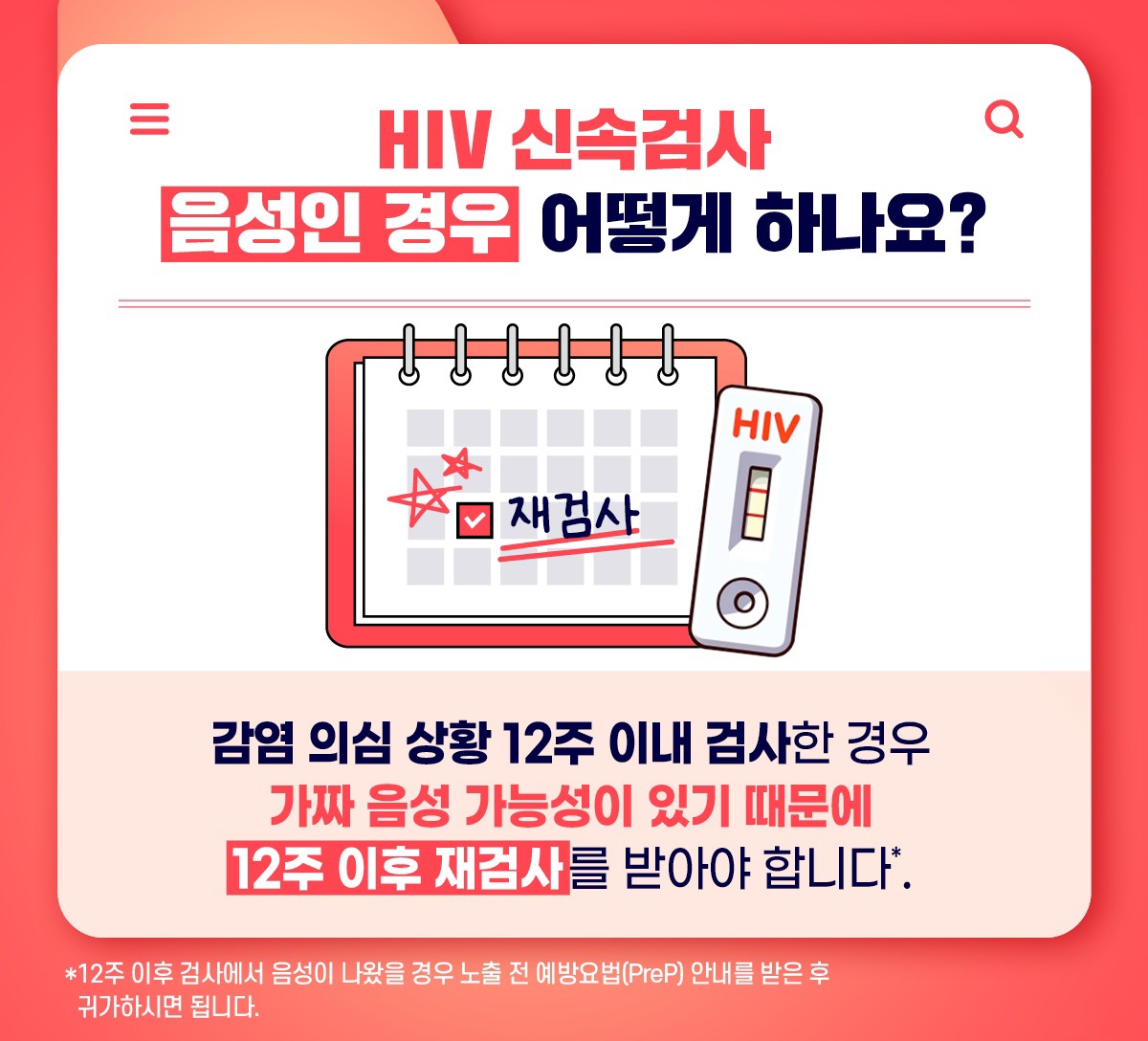 *12주 이후 검사에서 음성이 나왔을 경우 노출 전 예방요법(PreP) 안내를 받은 후 귀가하시면 됩니다.