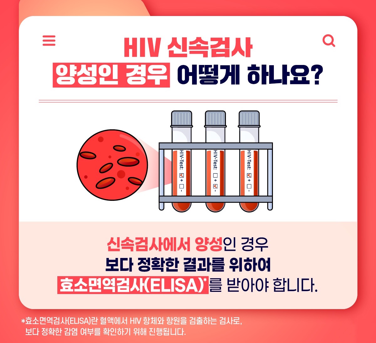 *효소면역검사(ELISA)란 혈액에서 HIV 항체와 항원을 검출하는 검사로, 보다 정확한 감염 여부를 확인하기 위해 진행됩니다.