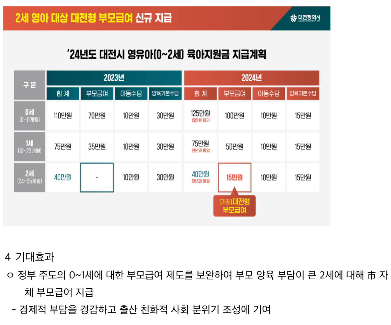 대전형 부모급여 지급을 통해 0~1세와 마찬가지로 많은 양육비용이 소요됨에도, 별도의 부모급여가 지원되지 않아 경제적 부담이 컸던 8천여 명의 2세 영아 부모의 양육비 부담이 상당한 부분 경감될 것으로 보인다고 합니다.