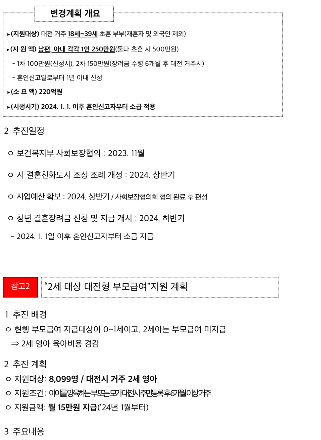 대전시장은 브리핑에서 청년부부에 대한 결혼장려금 지급을 조기 시행하고, 2세 영아 대상으로 대전형 부모급여를 신규 지급한다고 밝혔습니다.