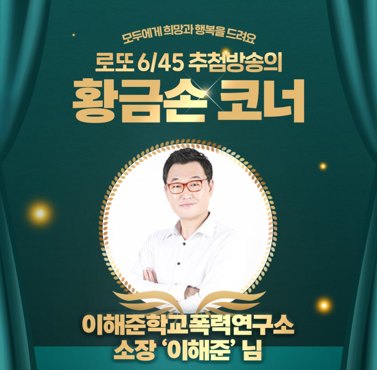 ‘이해준학교폭력연구소’ 이해준 소장이 1125회 MBC ‘생방송 행복드림 로또 6/45’ ‘황금손’으로 출연한다고 합니다.