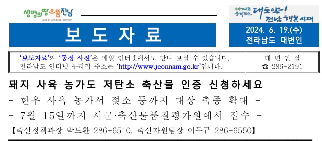 전라남도는 한우 사육 농가만 해당됐던 저탄소 축산물 인증 대상이 젖소와 돼지 농가로 확대됨에 따라, 참여 희망 농가 접수를 2024년 7월 15일까지 받는다고 밝혔습니다.