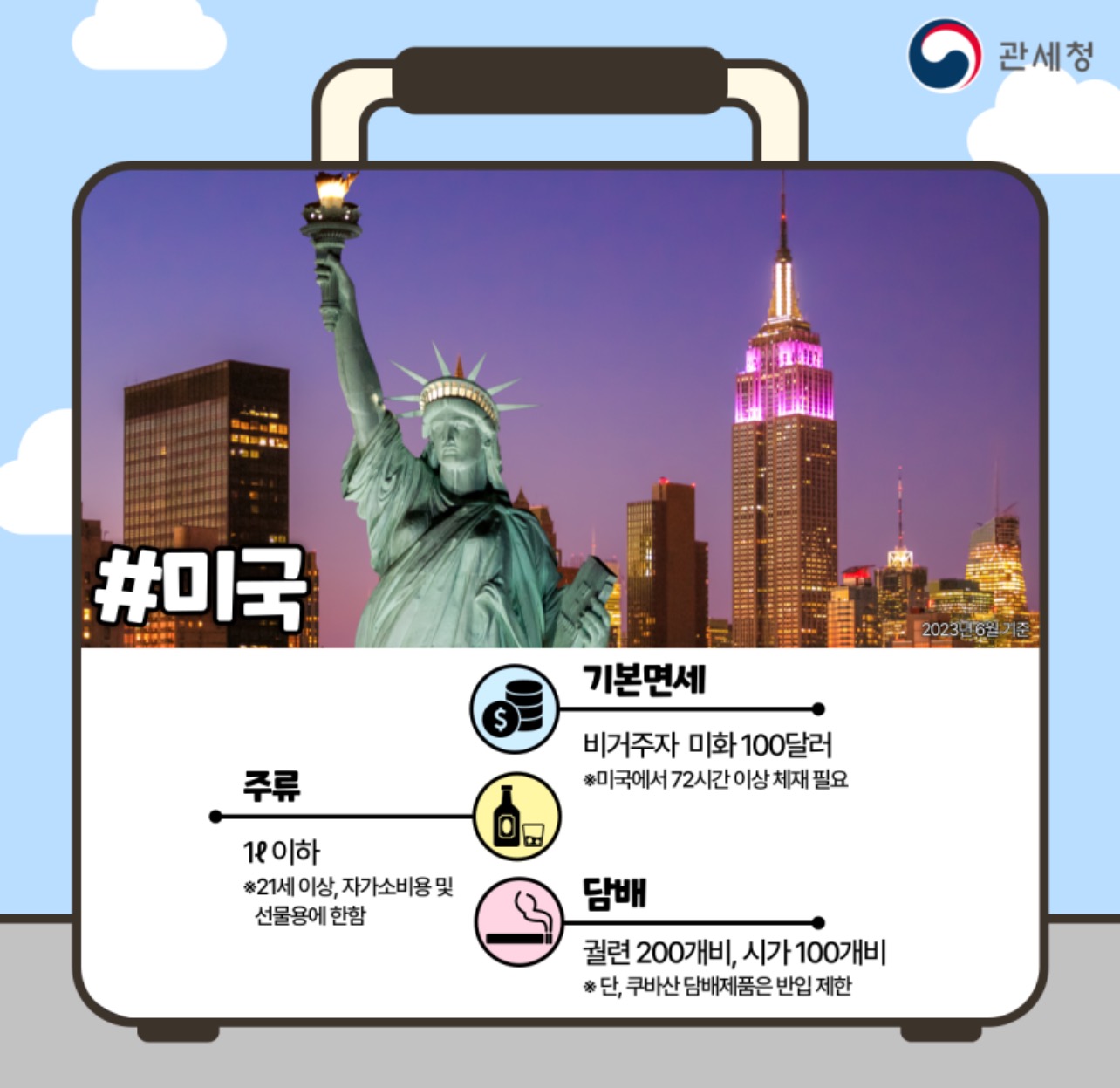 ✔️주류 2병(전체 용량 20이하+총 가격 미화 400달러 이하)