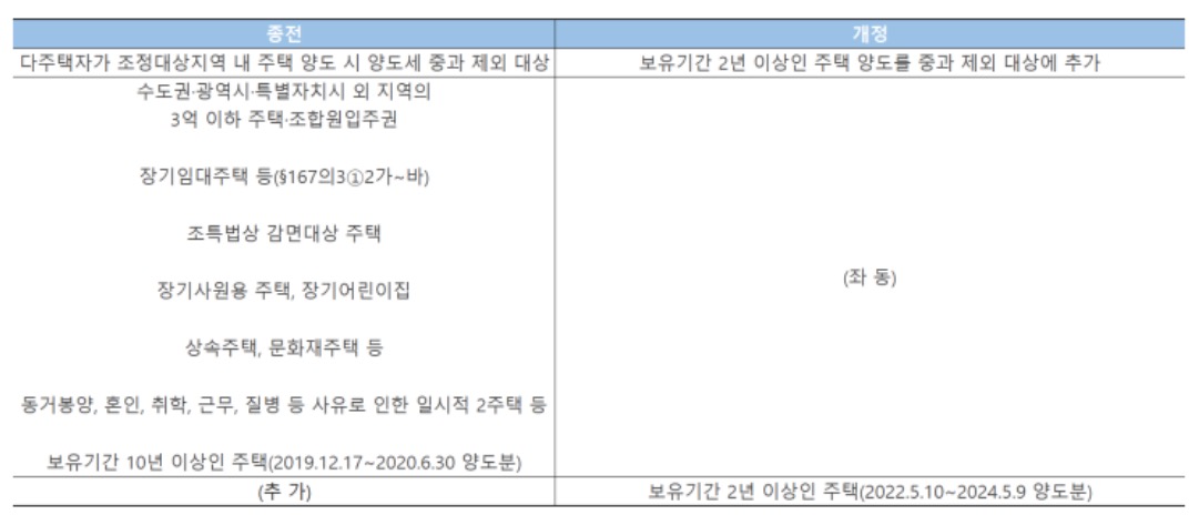 다주택자에 대한 양도소득세 중과 1년간 한시 배제하는 소득세법 시행령도 개정되었습니다.