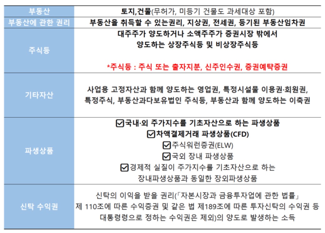 양도소득세가 과세되는 자산의 범위는 다음과 같습니다.