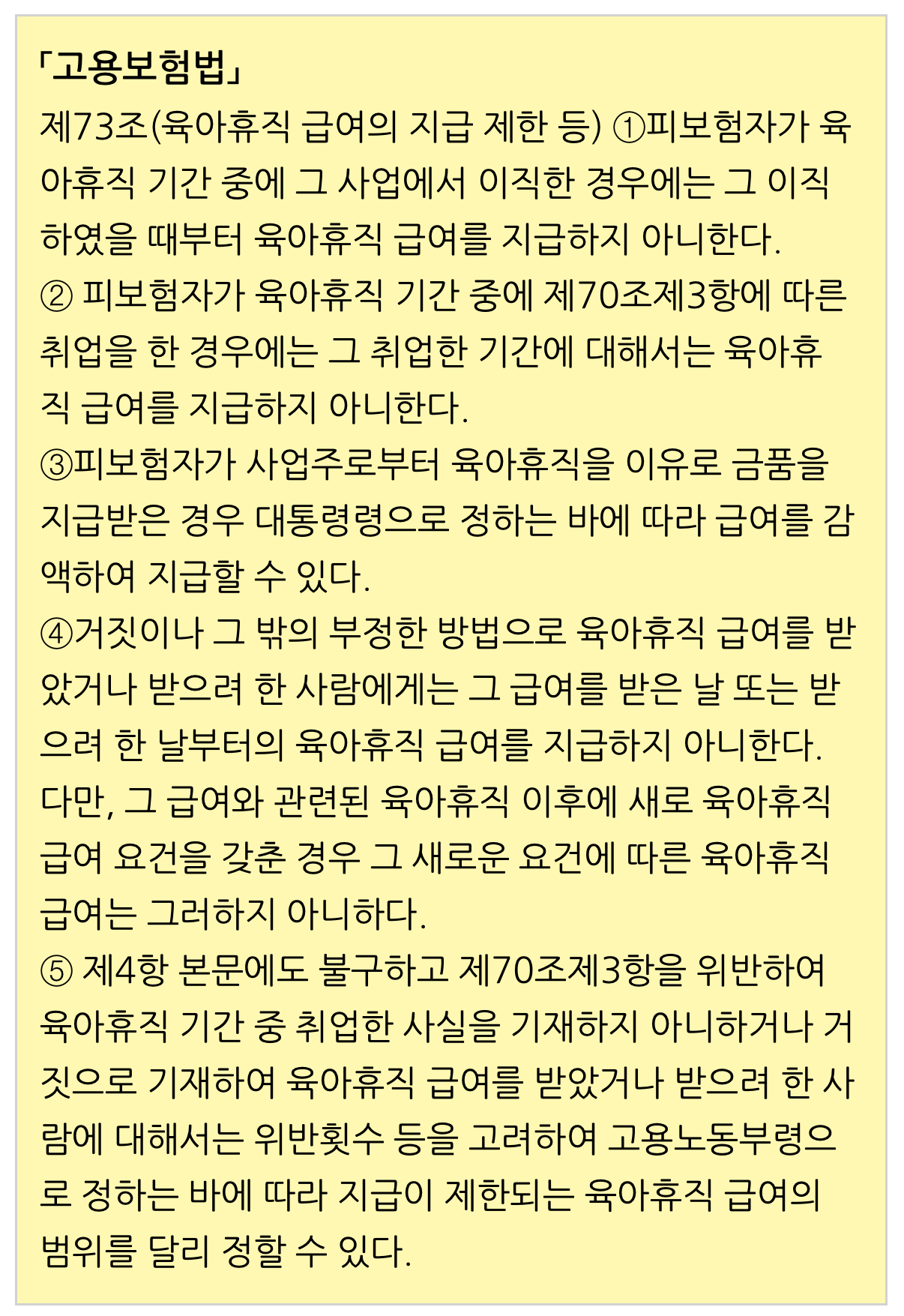 제73조(육아휴직 급여의 지급 제한 등) ①피보험자가 육아휴직 기간 중에 그 사업에서 이직한 경우에는 그 이직하였을 때부터 육아휴직 급여를 지급하지 아니한다.