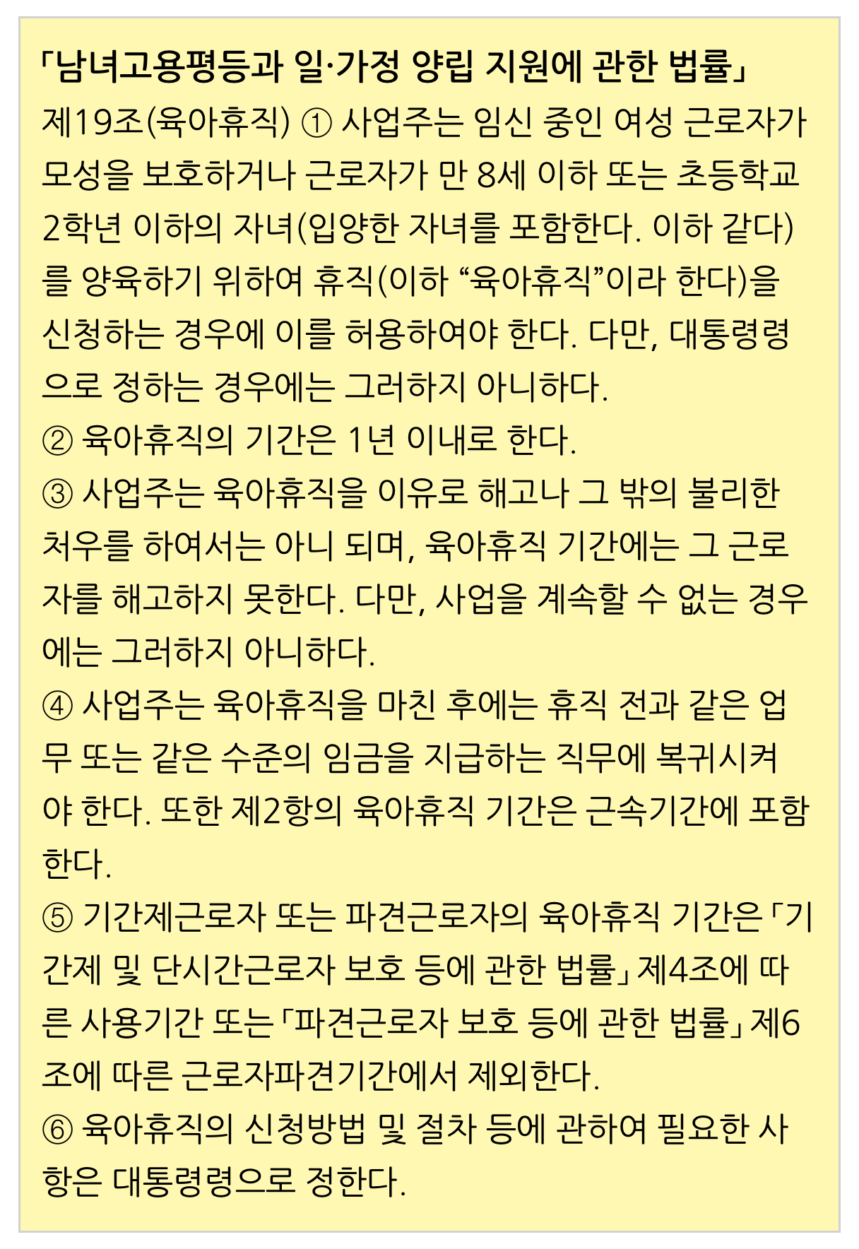 제19조(육아휴직) ① 사업주는 임신 중인 여성 근로자가 모성을 보호하거나 근로자가 만 8세 이하 또는 초등학교 2학년 이하의 자녀(입양한 자녀를 포함한다. 이하 같다)를 양육하기 위하여 휴직(이하 “육아휴직”이라 한다)을 신청하는 경우에 이를 허용하여야 한다. 다만, 대통령령으로 정하는 경우에는 그러하지 아니하다.