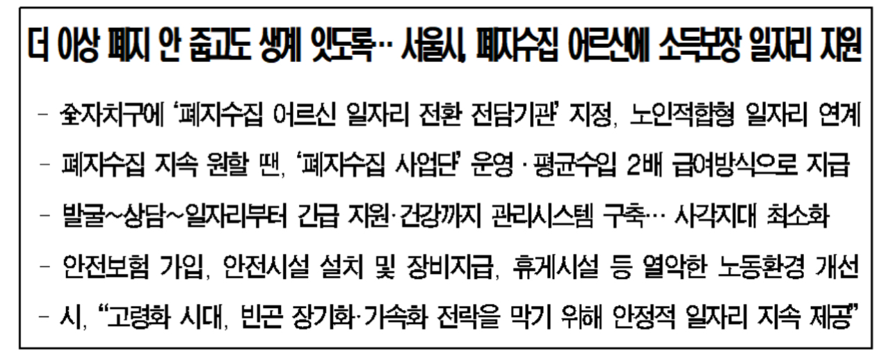 폐지수집 일자리사업단은 수집한 폐지를 자치구가 지정한 공동판매처에 갖다 주면 판매금액에 보조금을 더해 2배 수준(평균 30만원) 가량의 금액을 급여로 지급하는 방식이며 현재 13개구 1253명이 일하고 있다. 앞으로는 전 자치구 1800명으로 1.5배가량 확대할 계획이라고 합니다.