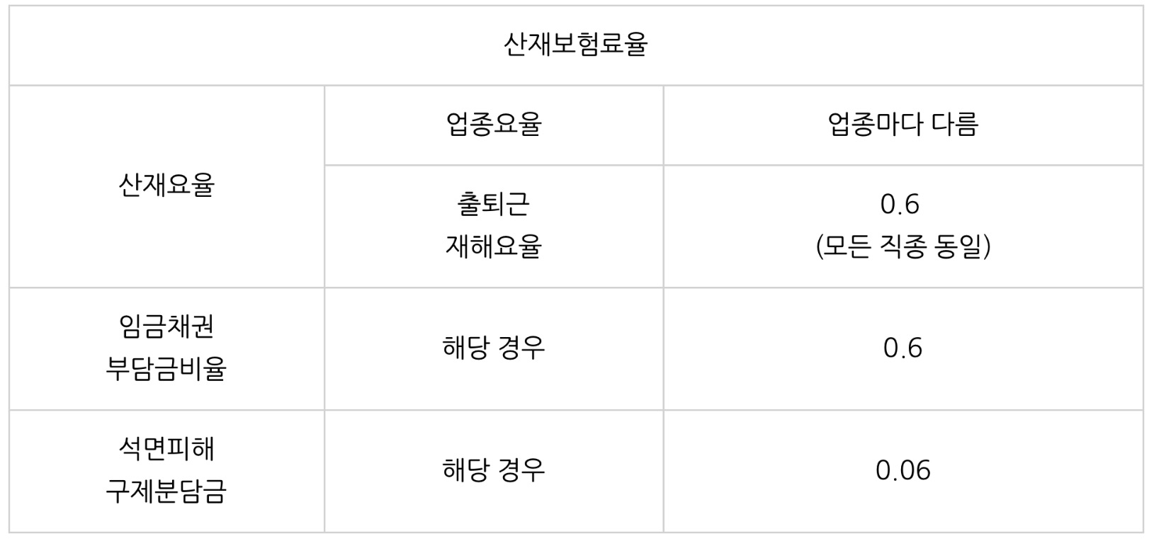 산재요율에 해당하는 업종요율은 본인의 직종마다 다른 보험요율을 가지고 출퇴근재해요율은 모든 직종에게 0.6으로 적용됩니다.