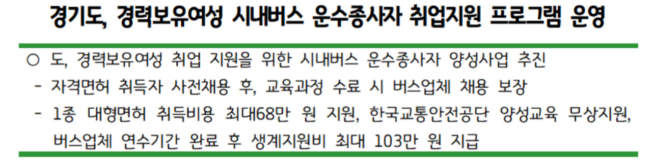 경기도가 2024년 7월부터 경력보유여성 등을 대상으로 시내버스 운수종사자 양성 프로그램을 시범 운영한다고 합니다.