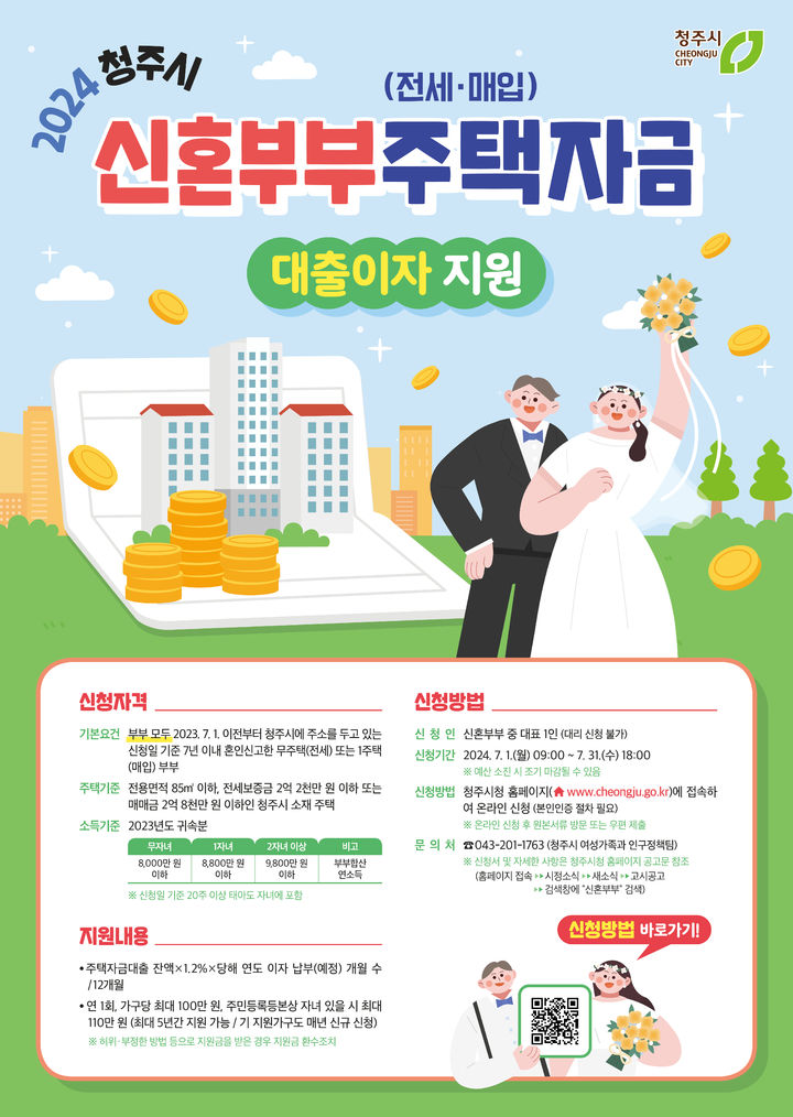 희망자는 2024년 7월 1일부터 31일까지 청주시청 홈페이지(https://www.cheongju.go.kr/www/index.do)에서 신청서를 내려받아 작성한 뒤 청주시 여성가족과(청주시 청원구 상당로 314)로 방문 제출하거나 시 홈페이지(시민참여-신청접수-신혼부부주택자금 대출이자 지원신청)로 신청하면 됩니다.