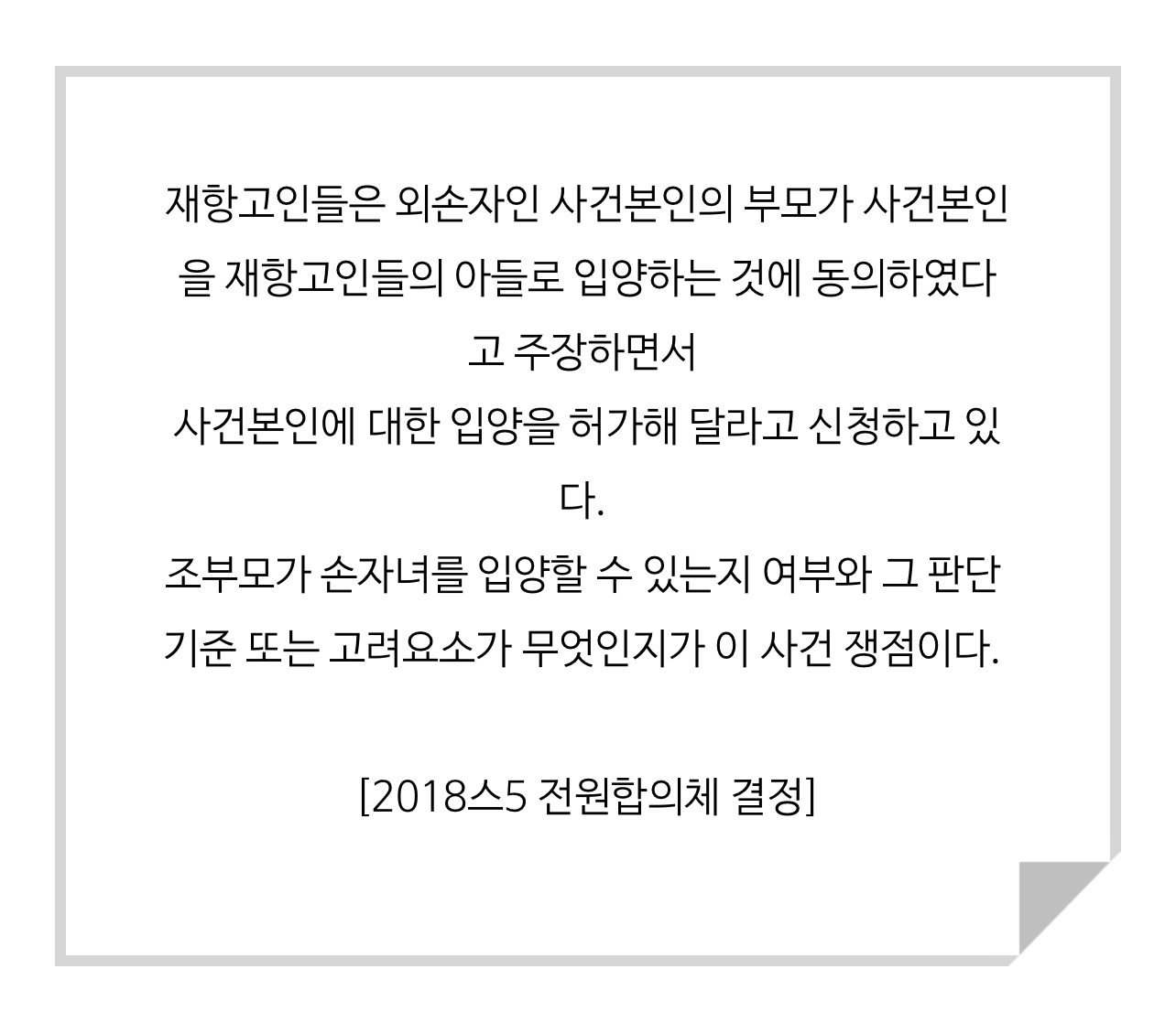 결론적으로, 대법원은 해당 사건에 관해 “조부모가 자녀의 입양 허가를 청구하는 경우에 입양의 요건을 갖추고 입양이 자녀의 복리에 부합한다면 이를 허가할 수” 있다는 판결을 했다고 합니다.