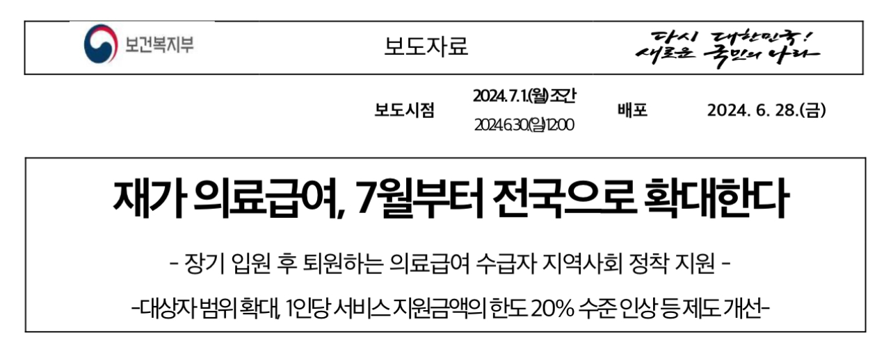 보건복지부는 지난 2019년부터 시범사업으로 운영해 온 재가 의료급여 사업을 2024년 7월부터 본사업으로 전환하여, 전국 229개 지역으로 확대한다고 밝혔습니다.