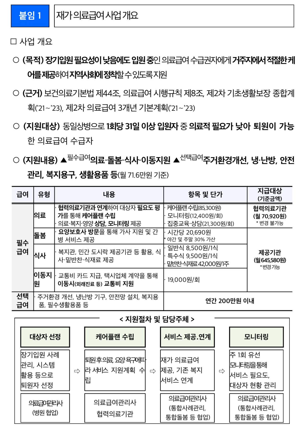 지원 대상자는 장기입원(1개월 이상) 중이지만 의료적 필요가 낮아 퇴원 가능한 의료급여 수급자로, 필요도 조사를 통해 돌봄계획을 수립한 다음, 해당 계획에 따라 의료·돌봄·식사·이동 지원의 필수 서비스와 주거 환경 개선·복지용품 및 냉난방 용품 제공 등의 선택 서비스를 제공받을 수 있습니다.