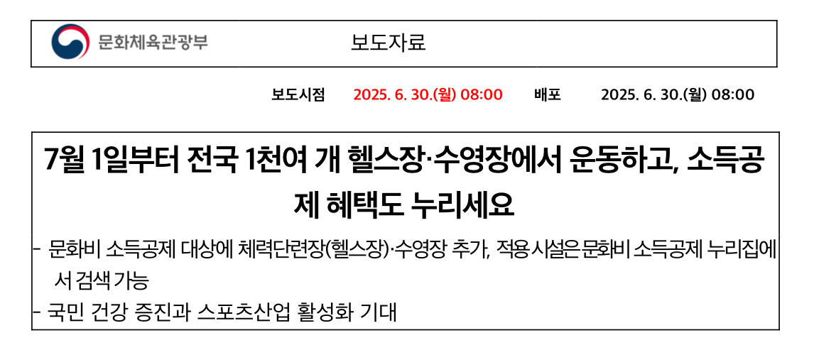 문화체육관광부는 한국문화정보원(원장 정운현)과 함께 2025년 7월 1일부터 전국 1천여 개 헬스장·수영장 시설이용료에 대해 소득공제를 받을 수 있게 된다고 밝혔습니다.