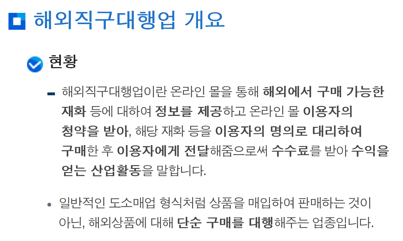 해외직구대행업이란 온라인 몰을 통해 해외에서 구매 가능한 재화 등에 대하여 정보를 제공하고 온라인 몰 이용자의 청약을 받아, 해당 재화 등을 이용자의 명의로 대리하여 구매한 후 이용자에게 전달해줌으로써 수수료를 받아 수익을 얻는 산업활동을 말합니다.