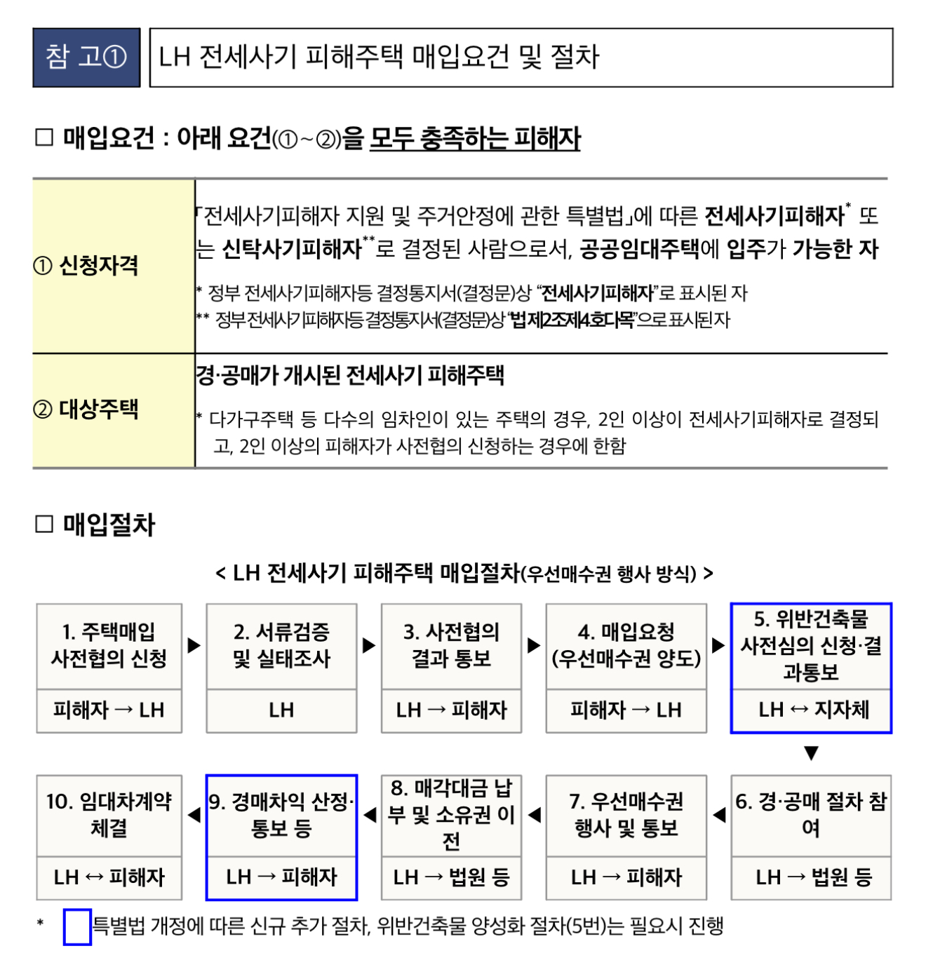 이번 개정법은 시행일 이전에 LH가 매입을 완료한 주택의 피해 임차인에게도 소급 적용이 가능하며 법 개정 전에 위반건축물 등의 사유로 매입 불가 통보를 받은 피해자도 재신청이 가능합니다.