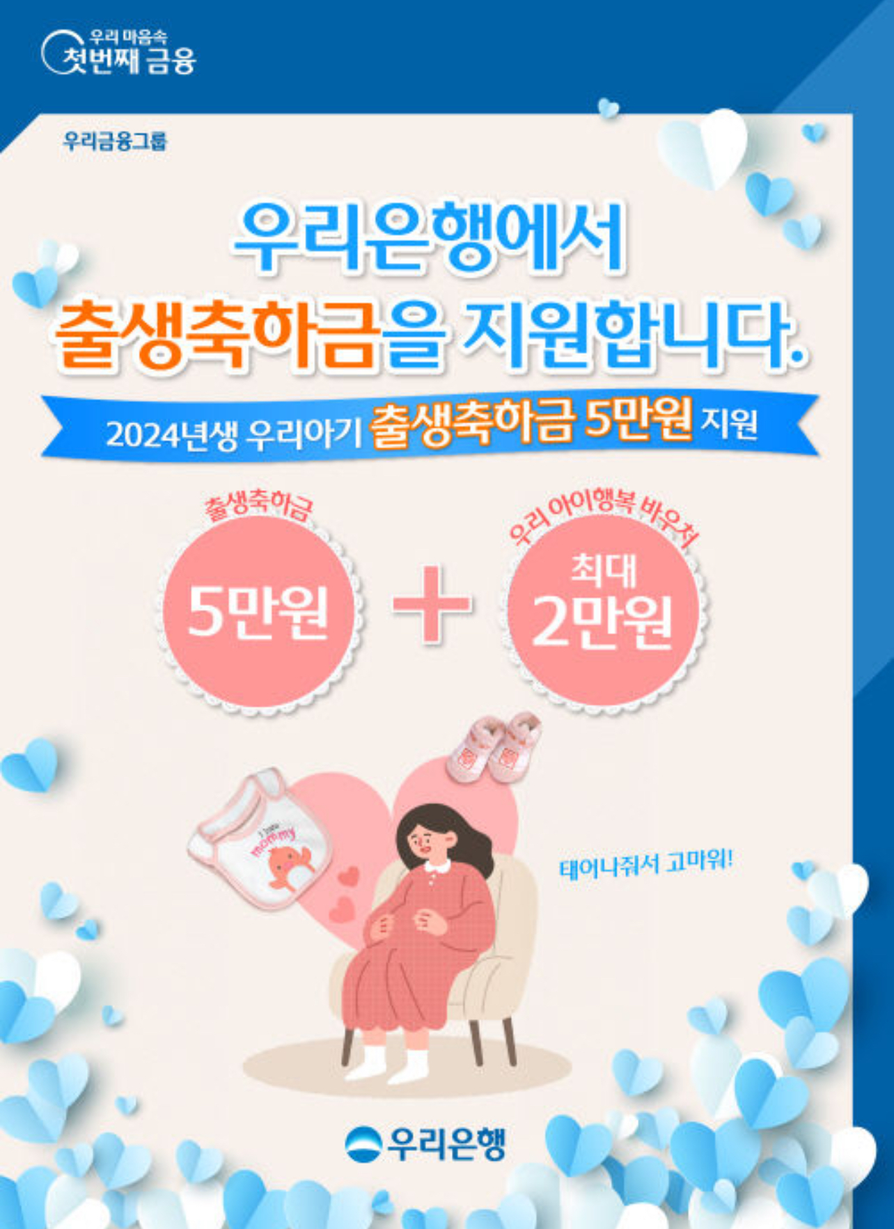 우리은행은 저출생 극복을 위한 상생금융의 일환으로 2024년생 전국민 출생축하금 지원 사업을 실시한다고 밝혔습니다.