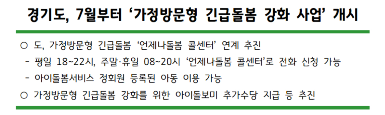 경기도가 2024년 7월부터 평일 야간, 주말, 공휴일에도 전화로 돌봄 신청을 받을 수 있는 ‘가정방문형 긴급돌봄 강화 사업’을 개시한다고 합니다.