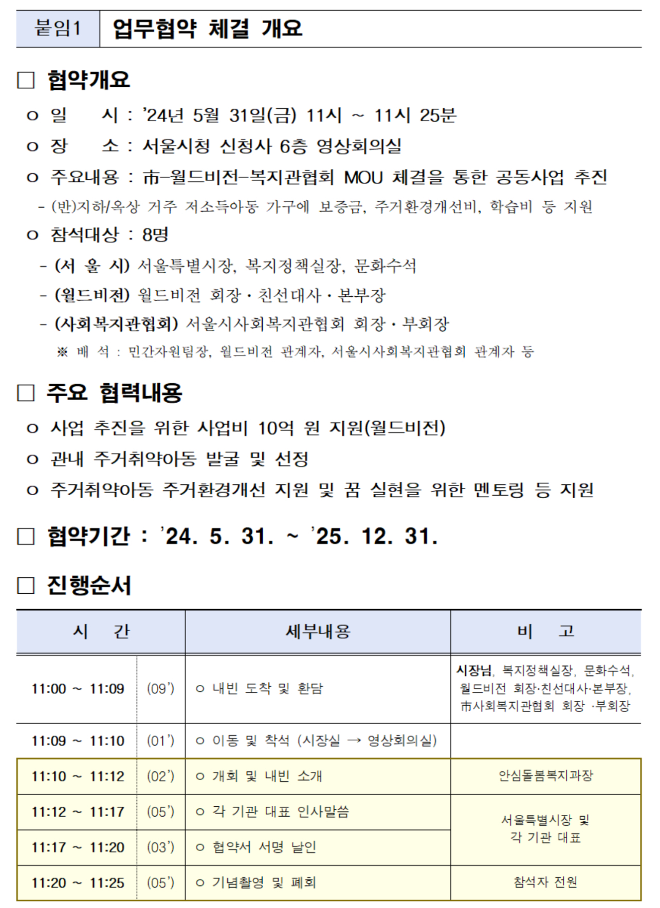 이번 협약을 통해 세 개 기관은 서울 시내 거주하는 기후위기 취약아동을 대상으로 주거환경 지원 사업과 꿈지원 사업을 추진한다는데 월드비전은 내년 2025년 말까지 사업비 10억원을 지원한다고 합니다.