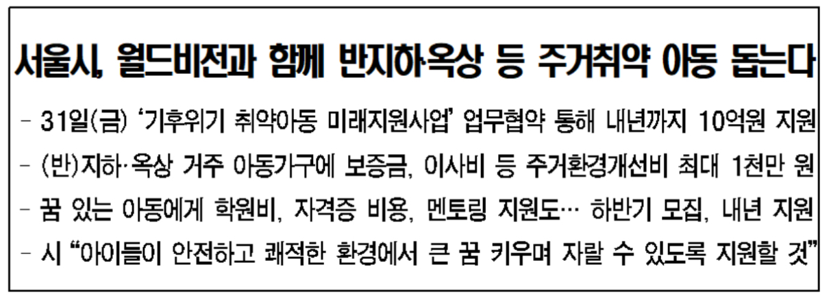 서울시가 반지하·옥상 등에 사는 주거빈곤가구 아동을 돕기 위해 나선다고 합니다.