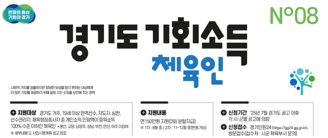 지급 기준은 기존 경기도에 주민등록을 둔 19세 이상 중위소득 120% 이하(월 287만 416원)인 현역선수, 지도자, 심판, 선수 관리자에서 올해부터 체육회, 종목단체 및 등록·지정스포츠클럽에서 근무하는 선수 출신 체육행정종사자와 도내 선수단을 이끌고 체육대회에 출전한 지도자가 추가됐다고 합니다.