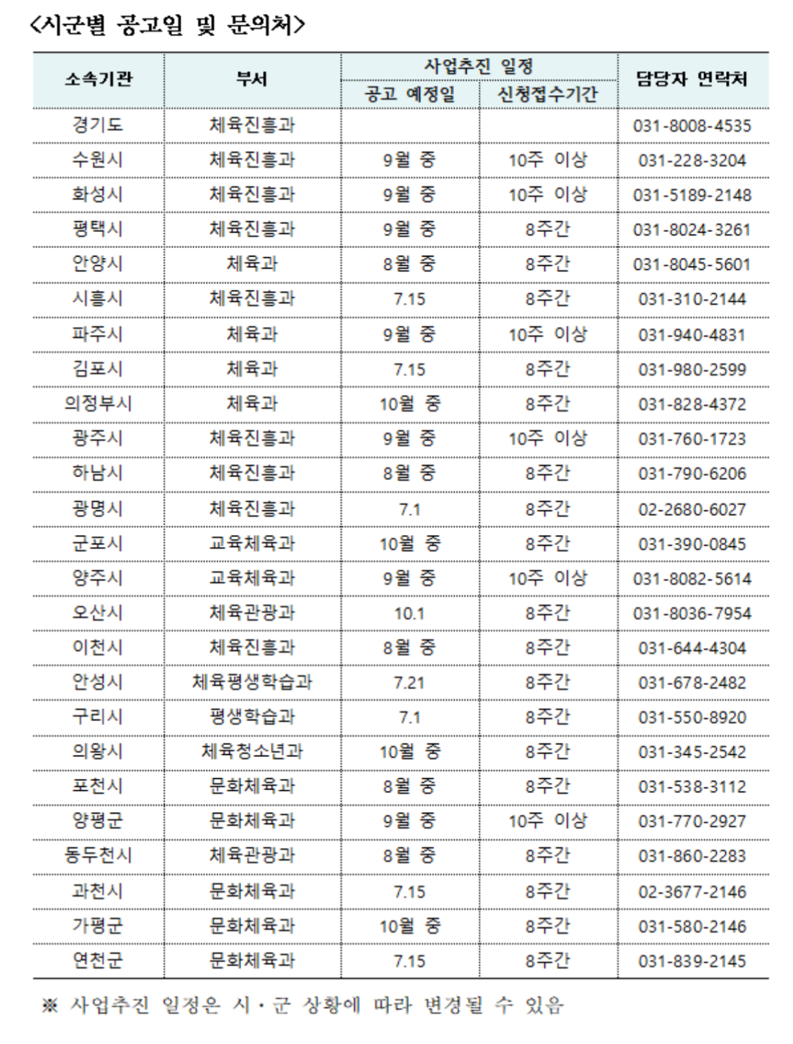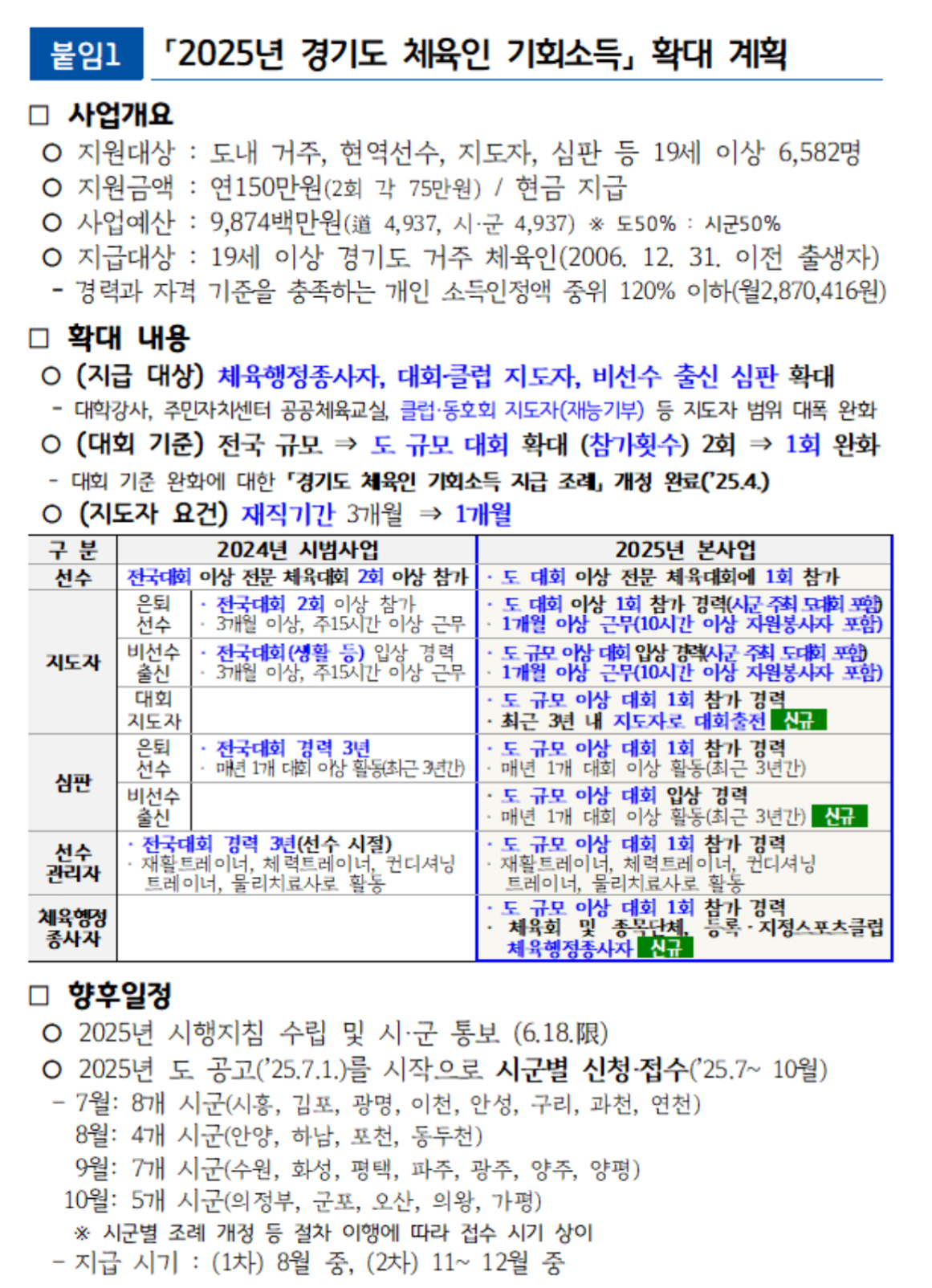 앞서 경기도는 지난해 시범사업 결과를 바탕으로 전문가, 체육인, 시군 관계자 의견을 적극 수용해 올해 4월 조례 개정을 완료하고, 6월 4일 보건복지부로부터 사회보장제도 변경 협의를 마쳤다고 합니다.