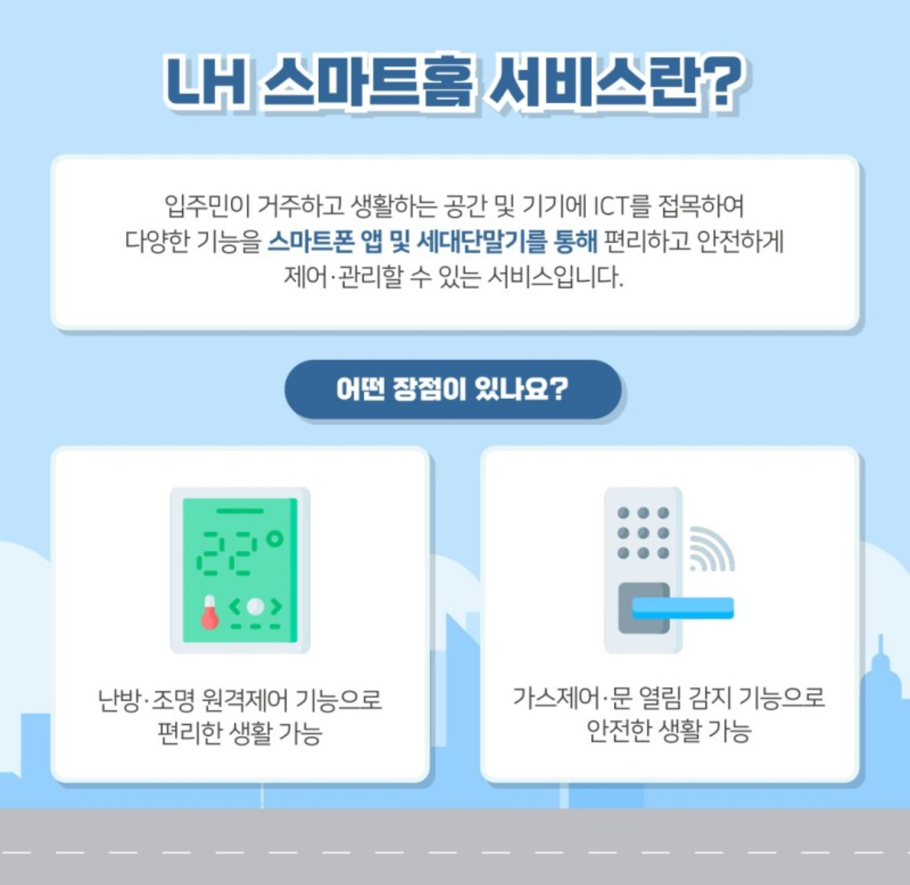 LH 스마트홈 서비스란 입주민이 거주하고 생활하는 공간 및 기기에 ICT를 접목하여 다양한 기능을 스마트폰 앱 및 세대 단말기를 통해 편리하고 안전하게 제어•관리할 수 있는 서비스를 말합니다.