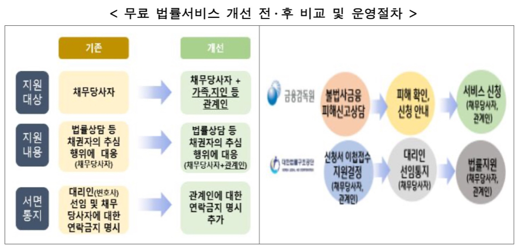 다만, 현행 제도는 무료 법률서비스 지원 대상을 채무당사자로 한정하고 있어, 당사자의 채무로 인해 불법 추심 피해를 입은 가족‧지인 등 관계인을 직접적으로 보호하는 데에는 한계가 있다는 지적이 있었다고 합니다.