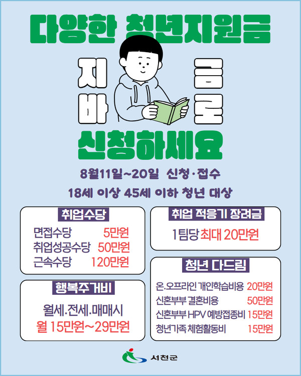 서천군은 청년들의 취업 적응 및 안정적인 지역 정착을 돕기 위한 각종 청년 지원사업에 대해 신청을 받는다고 밝혔습니다.