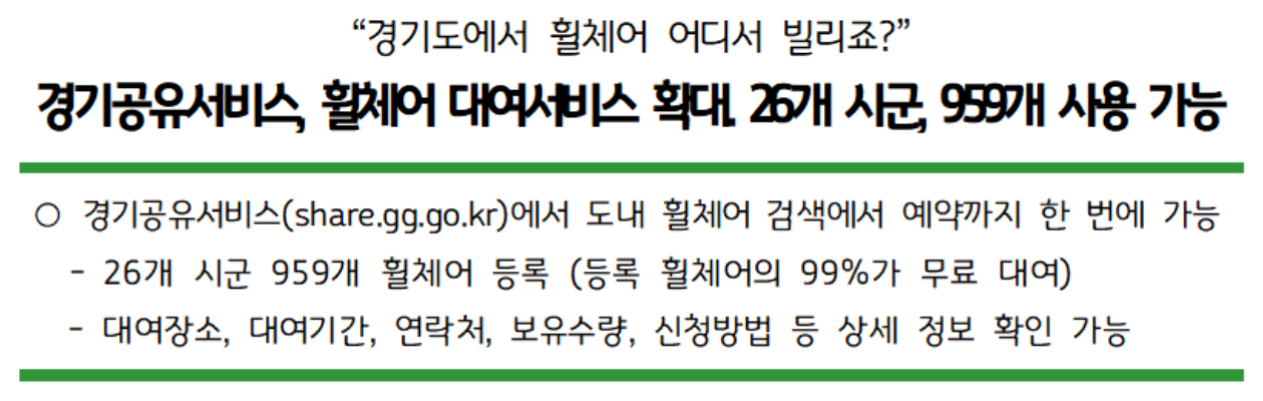 경기도 통합예약시스템인 경기공유서비스(share.gg.go.kr)가 도내 휠체어 대여 서비스를 기존 9개 시군 108개에서 26개 시군 959개로 확대했다고 합니다.
