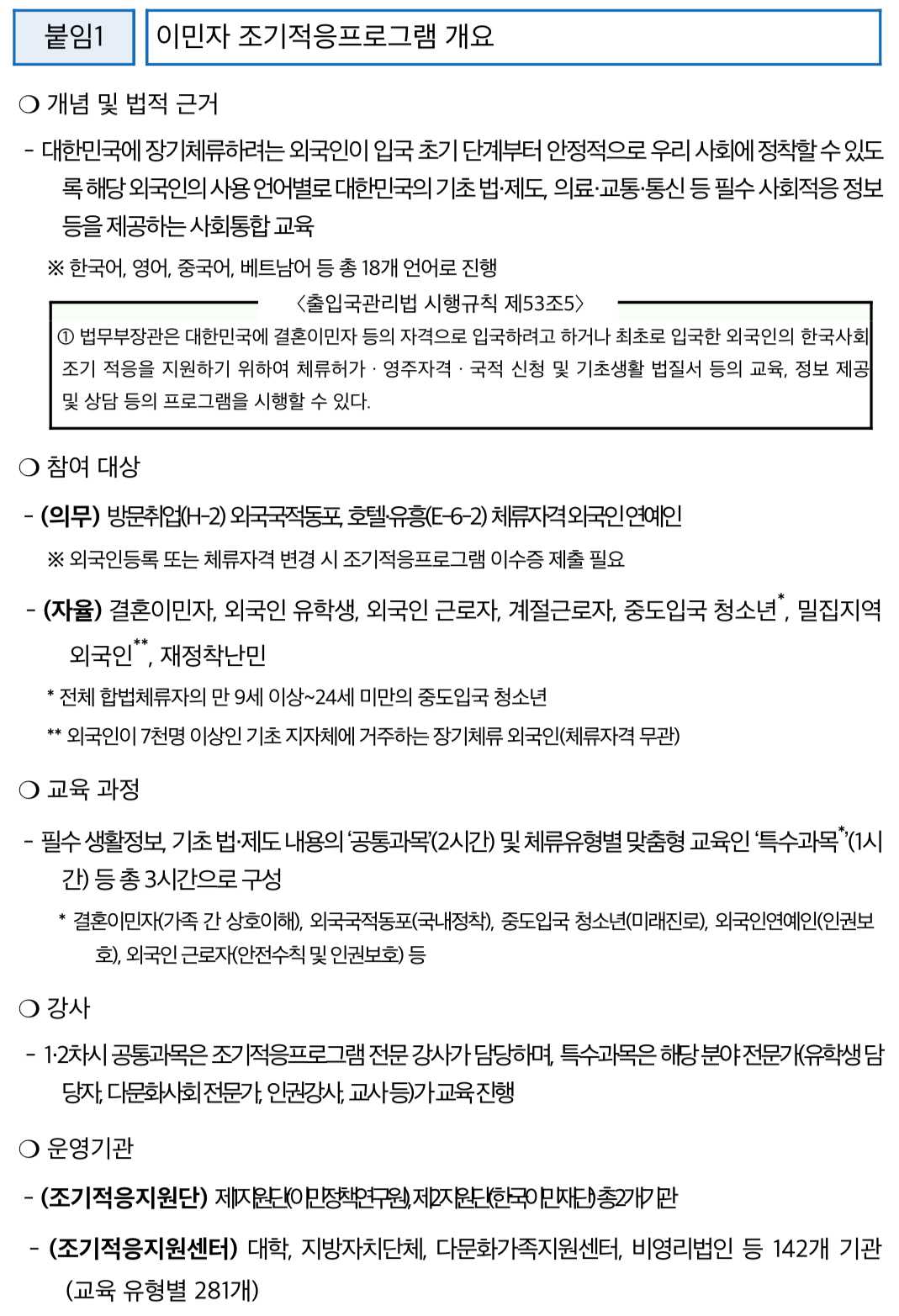 * 입국 초기의 외국인이 우리 사회에 안정적으로 적응할 수 있도록 해당 외국인의 사용 언어별로 대한민국의 기초법·제도와 다양한 생활정보 등을 제공하는 사회통합교육