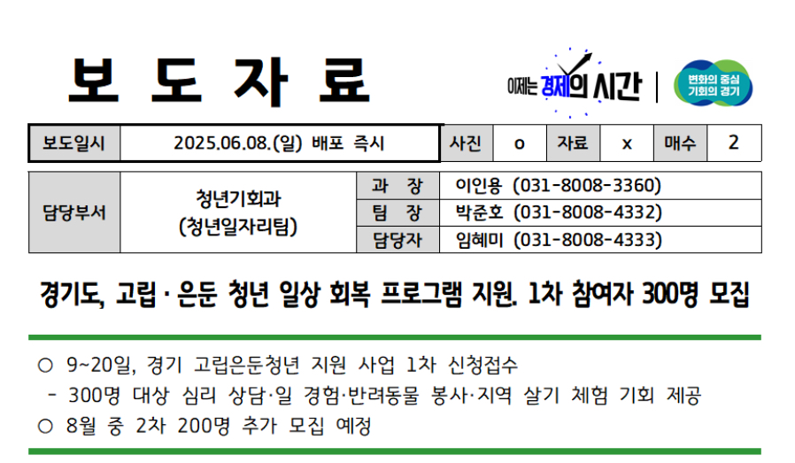 경기도는 고립·은둔 청년의 일상 회복을 돕기 위해 작년 200명에서 올해 500명으로 ‘경기 고립은둔청년 지원 사업’ 대상을 확대하고, 2025년 6월 9일부터 1차 참여자 300명을 모집한다고 합니다.