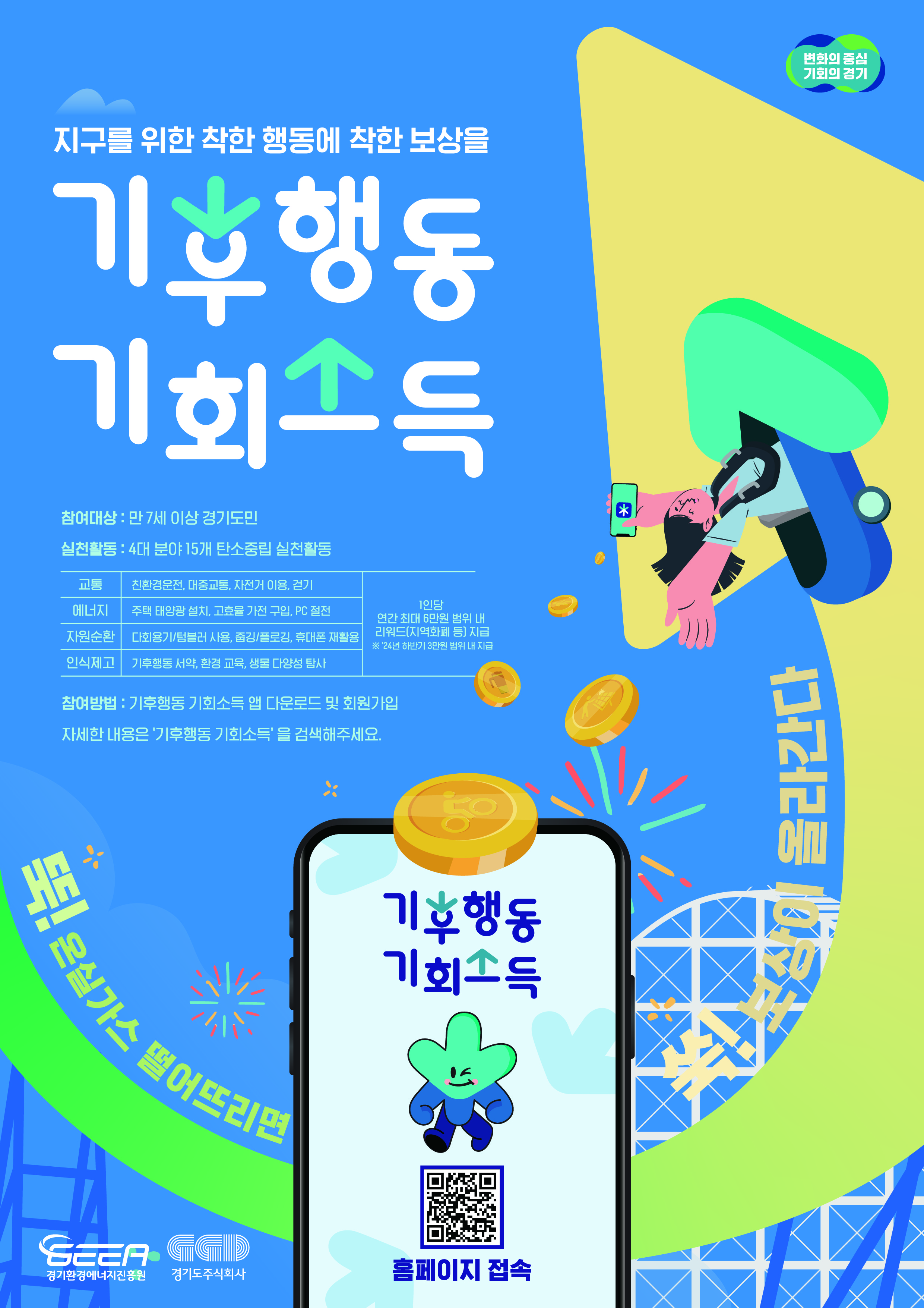 ‘기후행동 기회소득’은 일상생활 속에서 온실가스 감축활동인 ‘기후행동’에 대한 사회적 가치에 주목해 평가와 보상을 하는 정책으로 예술인·장애인·체육인·농어민·아동돌봄 기회소득과 더불어 민선 8기 경기도의 대표 정책입니다.