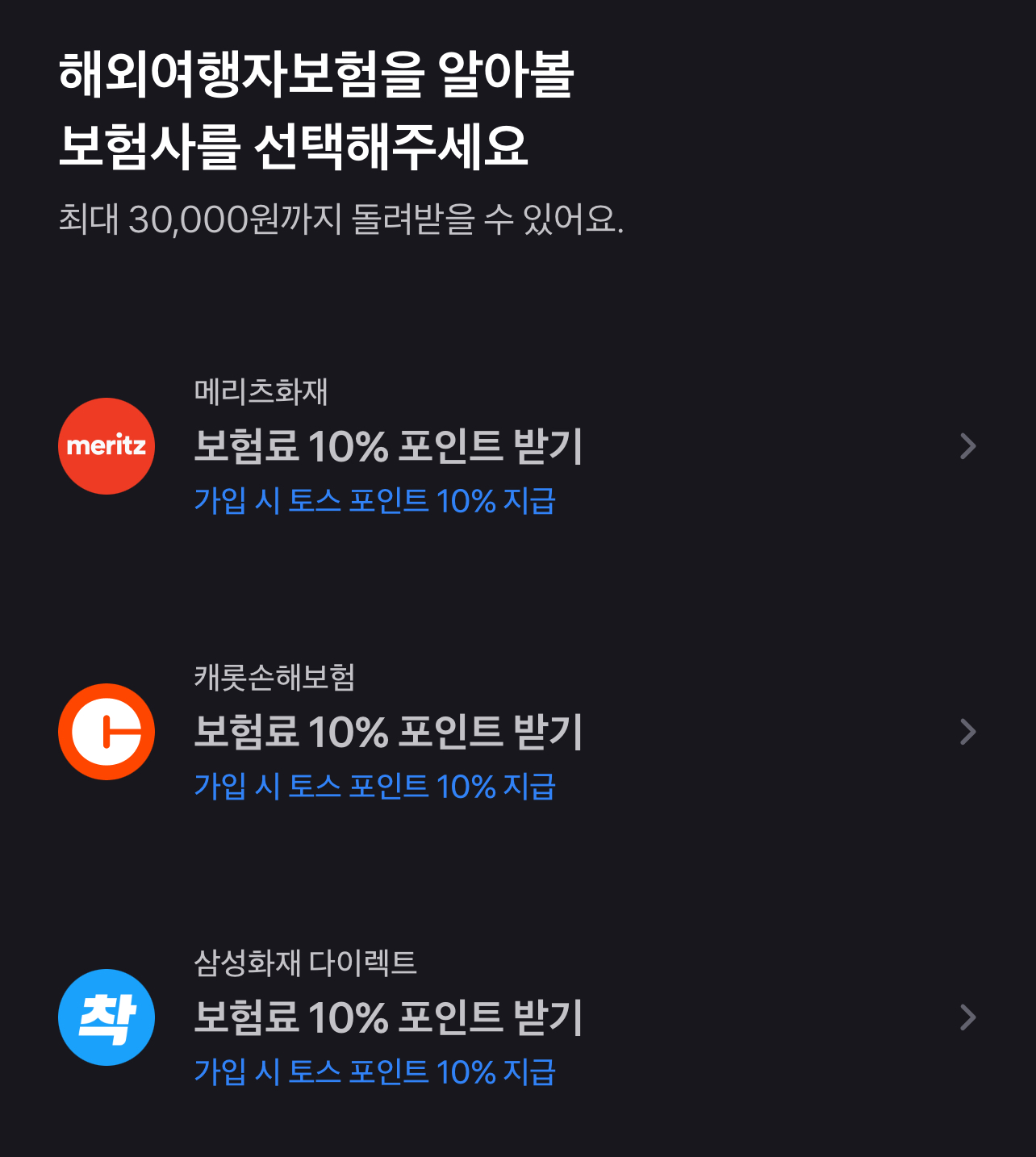 4. 메리츠화재, 캐롯손해보험, 삼성화재 다이렉트 중에서 원하는 토스 여행자보험 가입 하시면 됩니다.