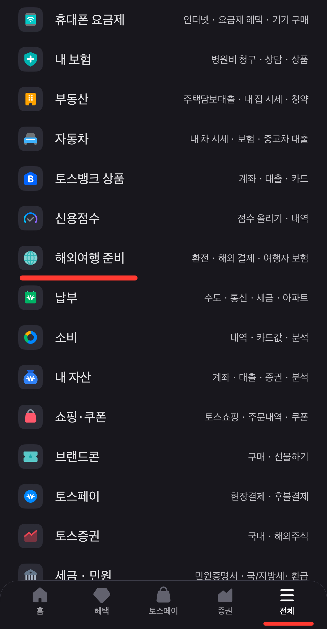 2. 하단 전체 메뉴 클릭 후 서비스탭에서 ‘해외여행 준비’ 클릭