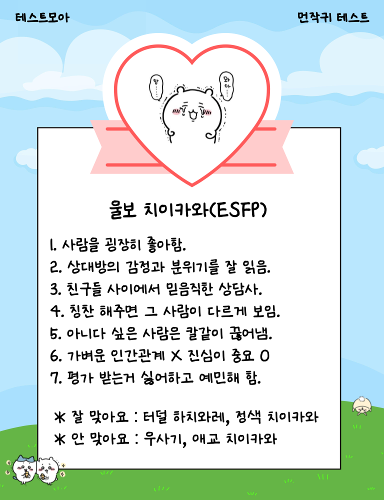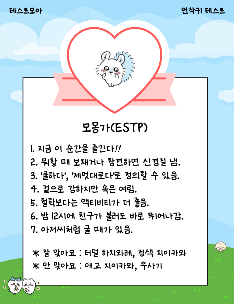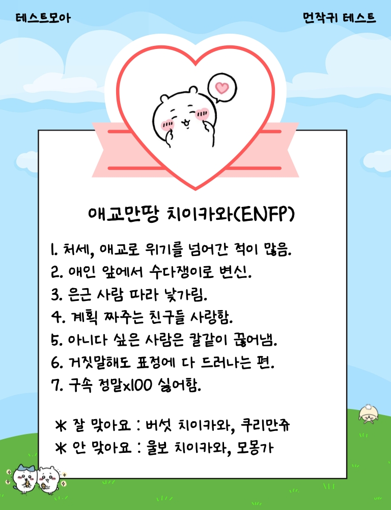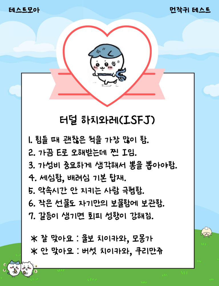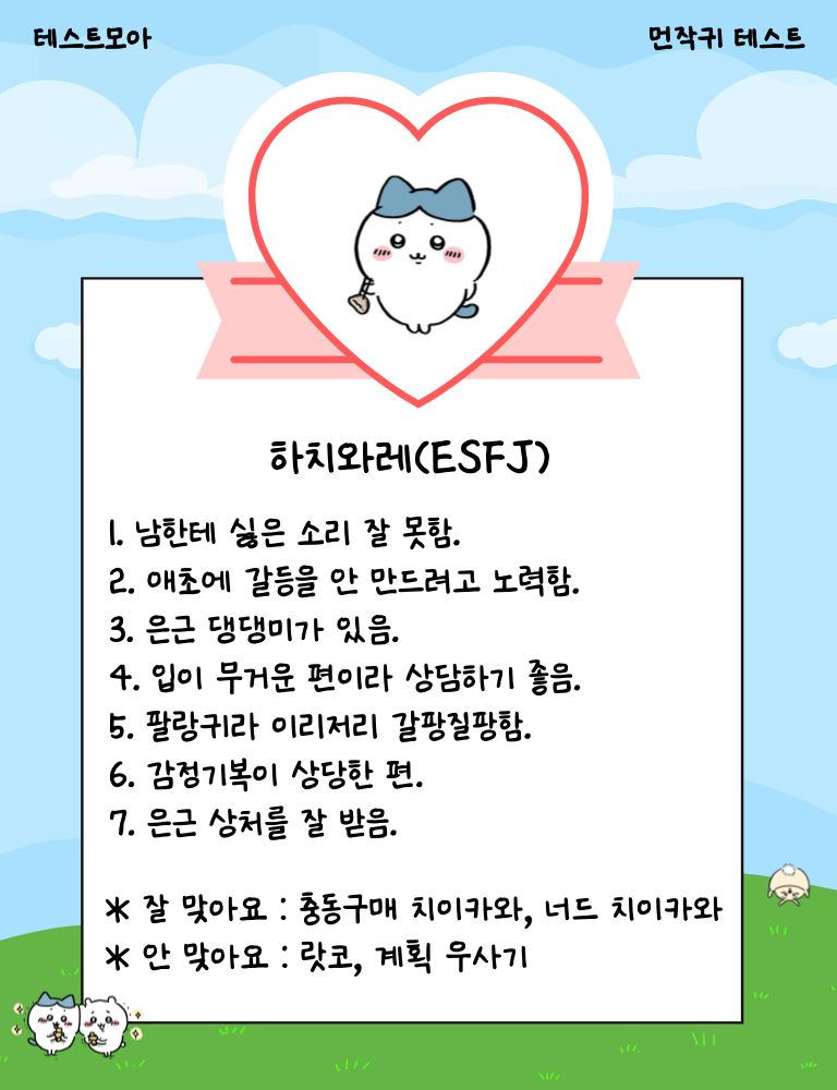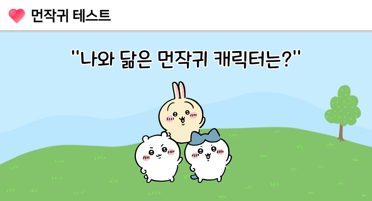 나와 닮은 먼작귀 캐릭터는 누구? 치이카와는 INFP, 우사기는 ENTP, 하치와레는 ESFJ 당신의 캐릭터는 무엇일지 지금 바로 테스트를 시작해 확인해보는 테스트모아라는 사이트에서 나온 ‘먼작귀 테스트’를 소개드리겠습니다.
